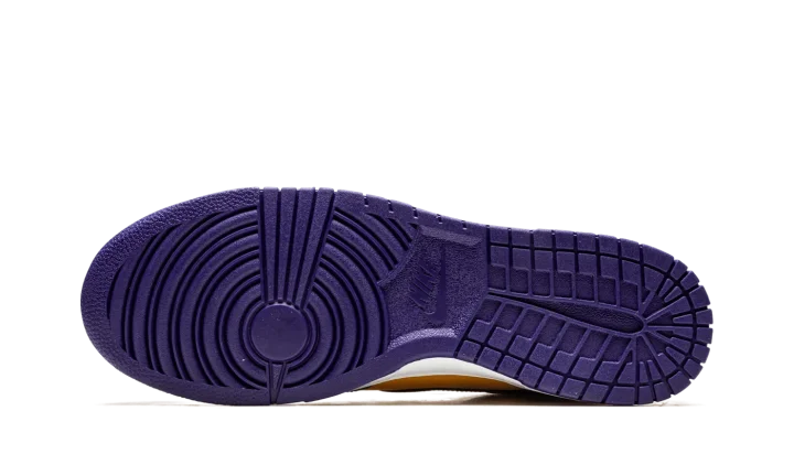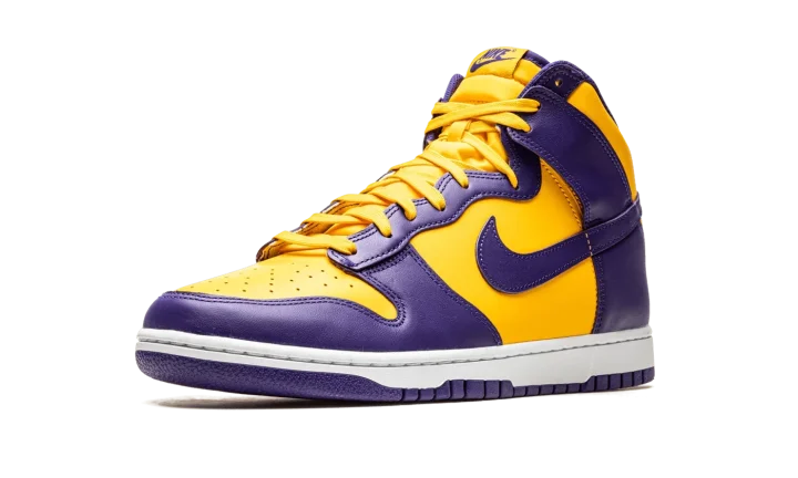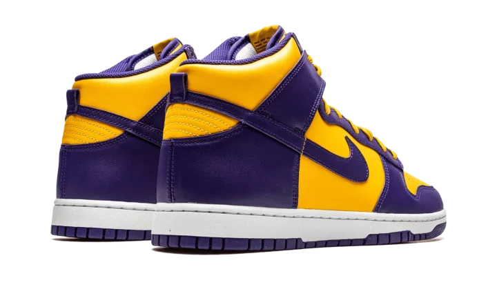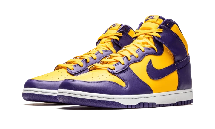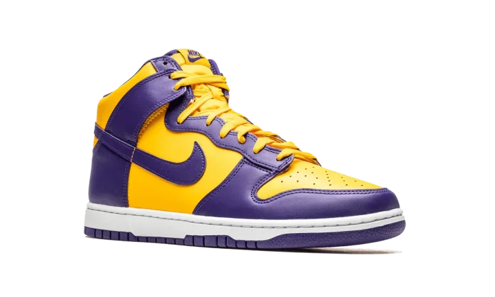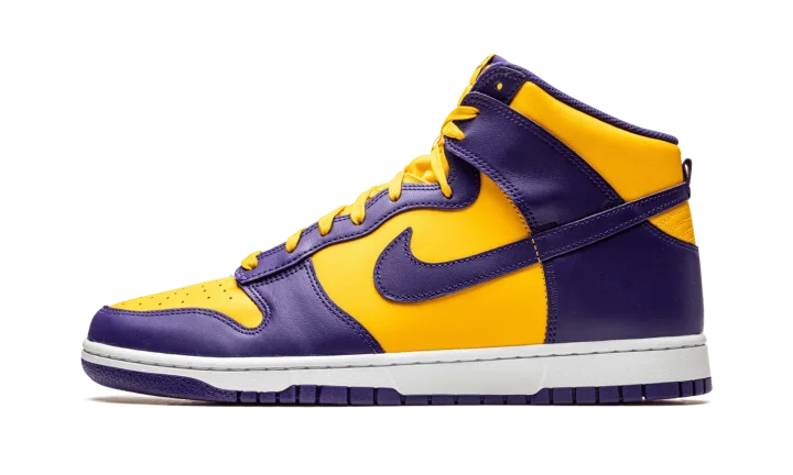 The Nike Dunk High "Lakers" is a colorway of the vintage basketball shoe that features the team uniform colors of the Los Angeles Lakers. The two-tone, yellow-and-purple "Lakers" Dunk High was released ahead of the '22-23 NBA season in September 2022. Sans official Lakers branding, the design nonetheless salutes the storied basketball team with its University Gold leather base with contrasting Court Purple leather overlays and Swoosh branding. The "Nike" and Swoosh logos on the yellow nylon tongue are also designed in purple. Yellow laces, a white midsole, and purple rubber outsole complete the look. Release date: September 22, 2022