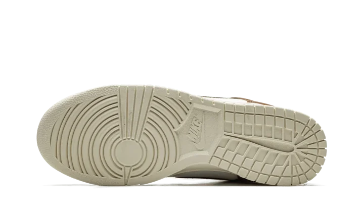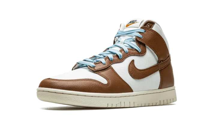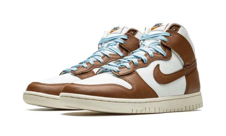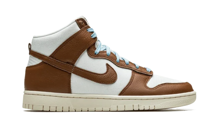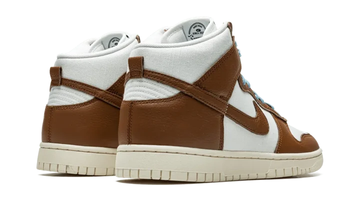 The Nike Dunk High Premium "Certified Fresh - Pecan" is a modified version of the retro basketball shoe with a slightly vintage-looking appearance. The shoe features a two-tone, white-and-brown design with a cream-colored rubber midsole that gives the shoe a decidedly vintage look. The perforated toe, mid-panel, collar, and heel are designed in white leather while the overlays and Swoosh appear in Pecan-colored tumbled leather. Icy blue laces contrast the shoe's neutral design. A "Nike" and Swoosh logo detail appears on the tongue. Release date: September 9, 2022