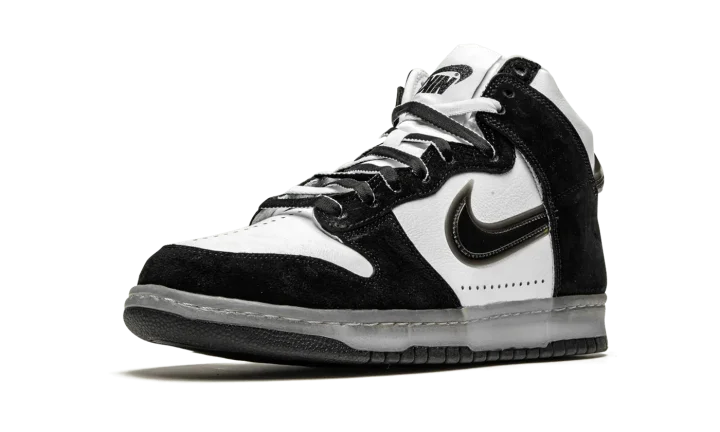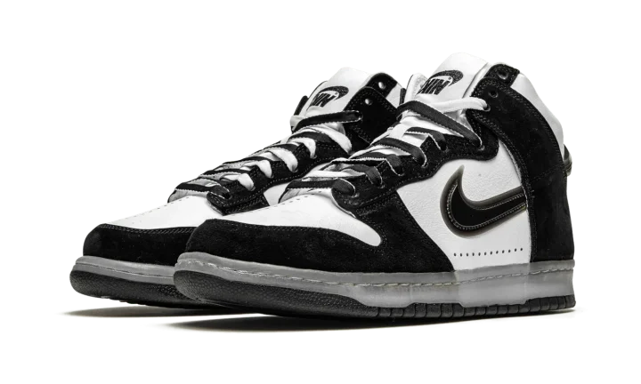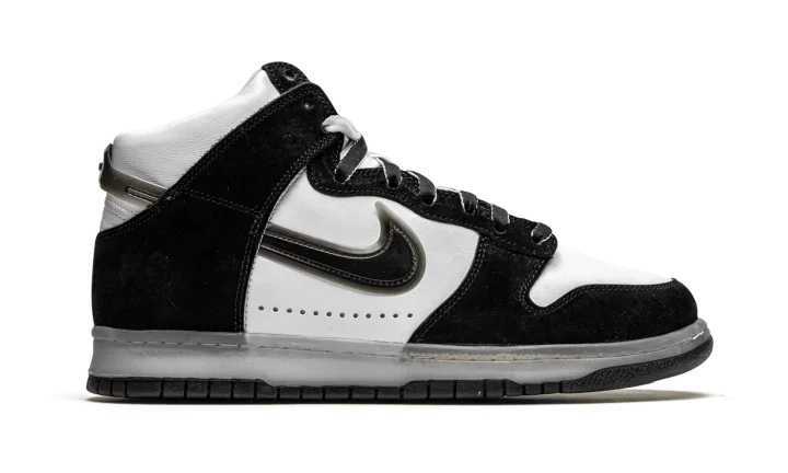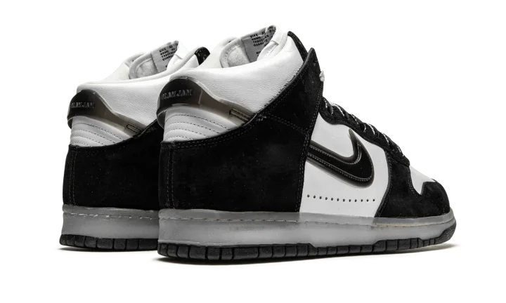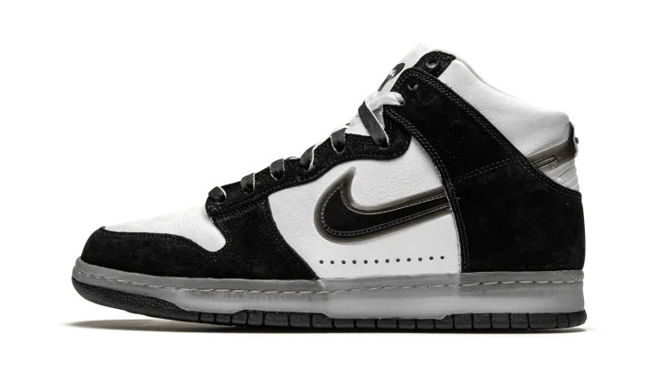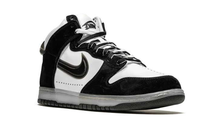 The Slam Jam x Nike Dunk High "Black/White" is an October 2020 collaboration between the Italian sneaker boutique and Nike on the all-time classic high-top shoe. Inspired by Slam Jam's rebellious attitude, the "Black/White" colorway features an upside down Nike Air logo on the tongue tag that pretty much summarizes what this simple yet nuanced look is all about. Other details include crisp white leather on the toe, mid-panel, and collar. Contrasting black synthetic nubuck overlays can be found on the forefoot, eyelets, collar, and heel. Slam Jam and Nike continue the black and white theme on the rest of the shoe, opting for black and white shoelaces on top of the white tongue. A semi-translucent gum colored Swoosh appears on either side of the shoe. Underfoot, a clear midsole and solid black outsole finishes off the look. Release date: October 30, 2020.