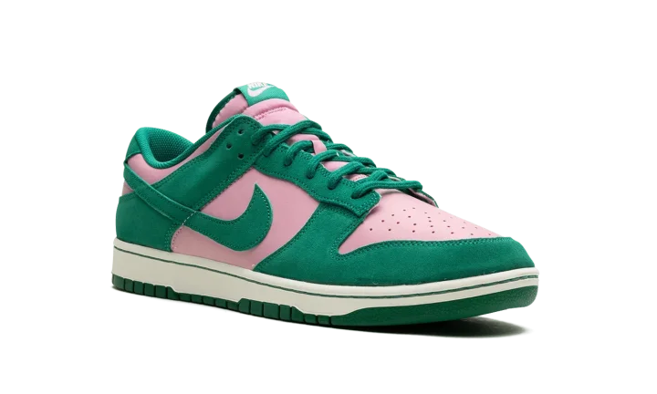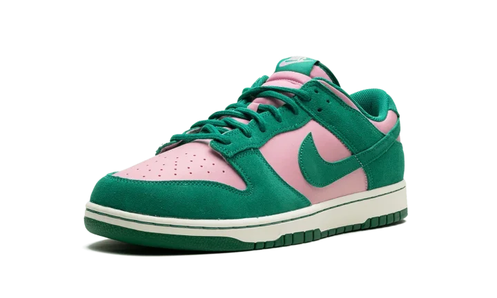 The Nike Dunk Low "Back 9 - Masters" is a colorway of the retro basketball shoe with a two-tone, green-and-pink color scheme. The upper is complete with a Medium Soft Pink leather base with Malachite-colored suede overlays and Swoosh branding. Classic "Nike" branding is embroidered on the heel tab. Another "Nike" logo can be found on the tongue tag above a Swoosh. Underfoot, the shoe's Sail midsole has an aged look, while a Malachite rubber outsole ties the look together. Release date: April 9, 2024