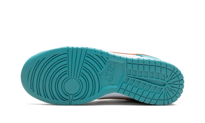 The Nike Dunk Low "Dolphins" is a colorway of the retro basketball sneaker that features the team uniform colors of the NFL's Miami Dolphins. In no way officially affiliated with the Dolphins, the colorway nicknamed after the football team nonetheless salutes the squad by featuring its uniform colors on its design. The upper has a white leather base with aqua leather overlays. An orange leather Swoosh is seen on both sides of the shoe. "Nike" branding is embroidered in white lettering on the orange leather heel tab. Aqua "Nike" and Swoosh logos are seen on the tongue tag. A white rubber midsole and aqua rubber outsole complete the look.