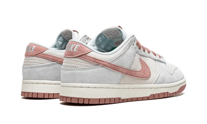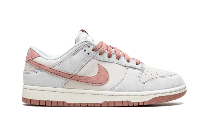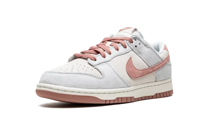 The Nike Dunk Low "Fossil Rose" is a colorway of the retro basketball shoe that was released in May 2022 and features a unique combination of washed out, pastel-colored hues on its design. This creative look for the Dunk Low features an all-suede upper with light grey on the perforated toe, mid-panel, collar, and heel. The shoe's suede overlay panels are designed in light blue and a red suede Swoosh is found on the sides. Classic white "Nike" branding is embroidered on the red suede heel tab. Release date: May 4, 2022