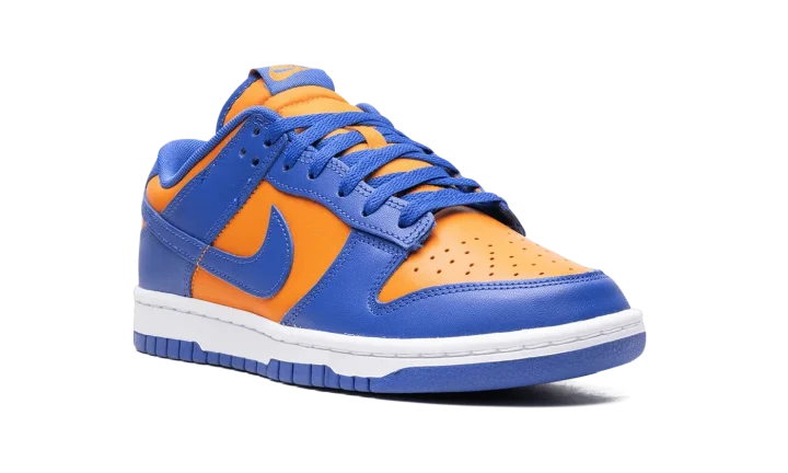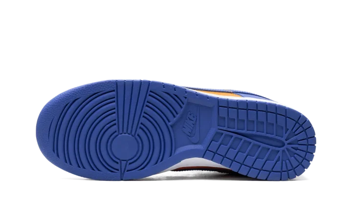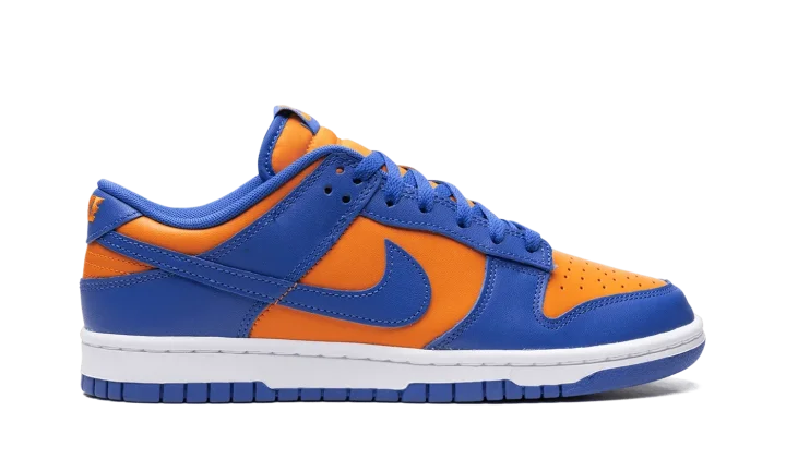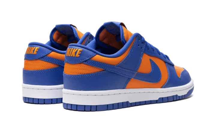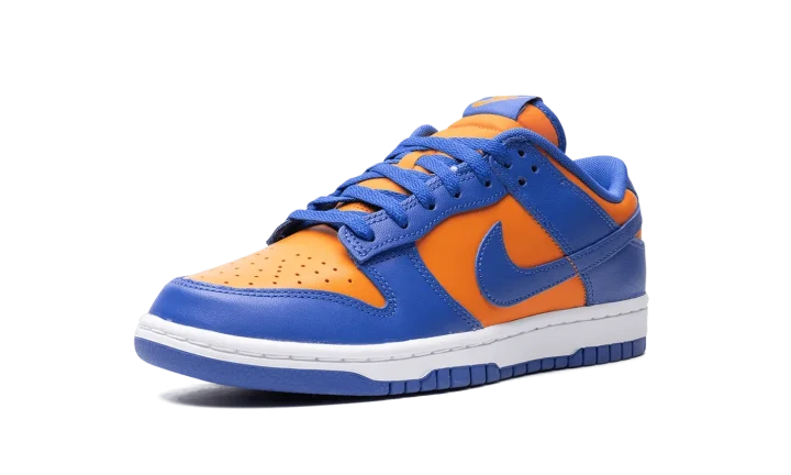 The Nike Dunk Low "Knicks" is a colorway of the retro basketball shoe in the colors of the New York Knicks. While not associated with the Knicks, the Dunk Low named after the NBA team nonetheless shows love to the squad with its orange-and-blue appearance, matching the colors found on the Knicks' team uniforms. The upper has an orange leather base and blue leather overlays and Swoosh branding. "Nike" branding is embroidered on the heel, and "Nike" and Swoosh logos appear on the tongue. A white midsole and blue outsole complete the look.
