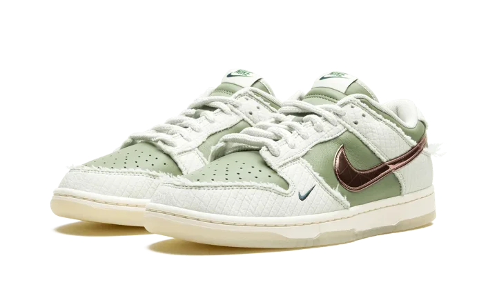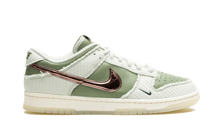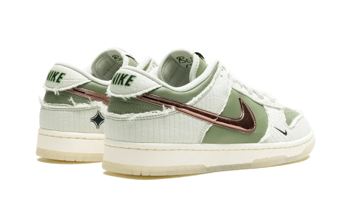The Kyler Murray x Nike Dunk Low "Be 1 of One" is a colorway of the retro basketball shoe co-designed by the talented football player. Inspired by positivity and inclusivity, the "Be 1 of One" Dunk Low demonstrates Nike's commitment to promote a healthy community around its sneakers—and beyond. The collaboration with the star NFL quarterback features an olive leather base with quilted light olive-colored overlays with frayed edges. Metallic rose gold Swoosh branding is seen on both sides of the sneaker. Classic "Nike" branding is seen on the heel and tongue tag. "Be 1 of One" detailing is found on the underside of the tongue while thick rope laces appear on top of the tongue. Underfoot, a cream midsole and translucent rubber outsole complete the look. Release date: November 10, 2023