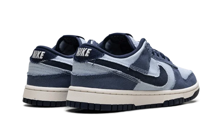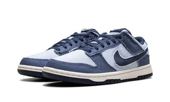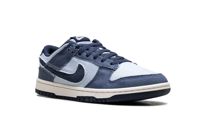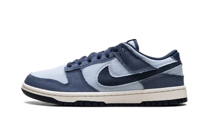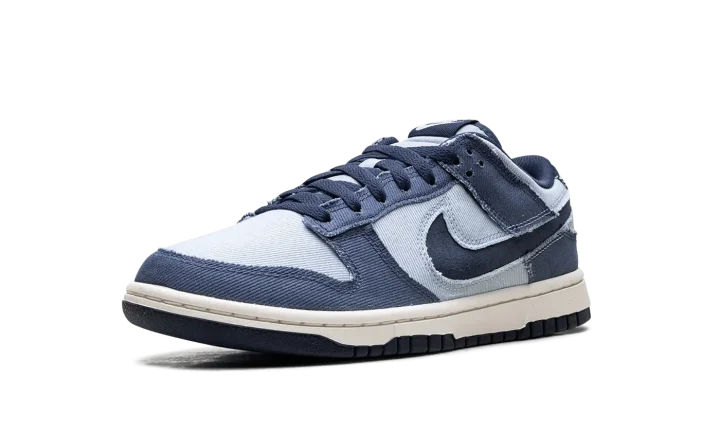 The Nike Dunk Low Light Armory Blue Denim is a low top sneaker featuring an upper crafted in multiple shades of Blue Denim. The Light Armory Blue base is overlaid by Diffused Blue, while the Swoosh pops in Midnight Navy. The Pale Ivory midsole meets a black outsole, and Nike branding on the tongue and rear heel tab finish the look.