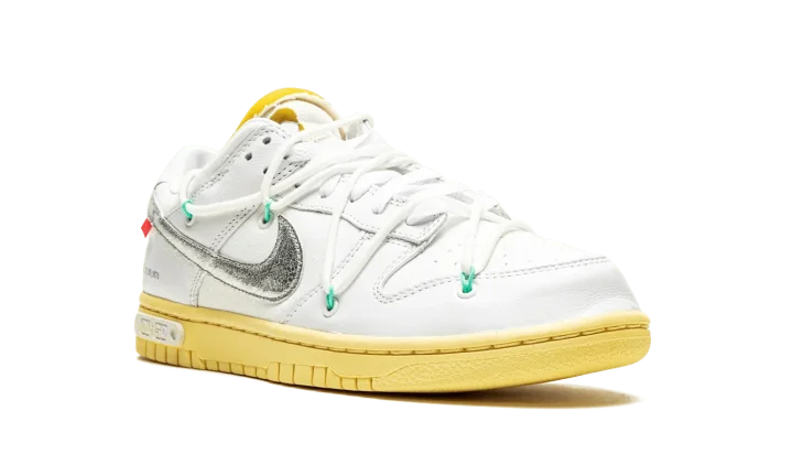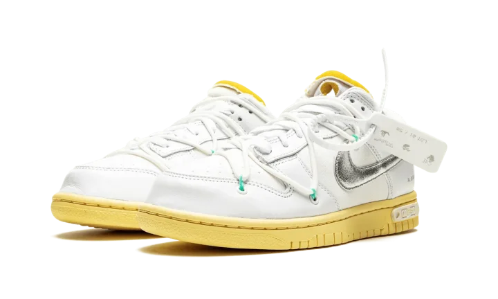 The Off-White x Nike Dunk Low "Lot 1" is the first colorway of Virgil Abloh and Nike's impressive "Lot 50" or "Dear Summer" Dunk collaboration from 2021. Succeeding Abloh and Nike's "The 10" collection from 2017, one of the greatest sneaker collaborations ever, the duo's "Lot 50" campaign finds 50 different arrangements of the classic low-top basketball shoe, each with unique materials and embellishments. Here, on "Lot 1," the upper is constructed in white leather for a timeless look. A Metallic Silver leather Swoosh appears on either side and orange "Nike" branding is embroidered on the heel. Abloh adds a secondary lacing system to the upper in addition to the traditional lacing setup that appears over the grey nylon tongue with exposed foam padding. The bungee cord-like look was first seen on Off-White's debut Nike Dunk collaboration from 2019. Signature Off-White Helvetica text is printed on the medial side. Underfoot, a vintage cream midsole with a "Lot 1 of 50" insert completes the look. Release date: August 2, 2021