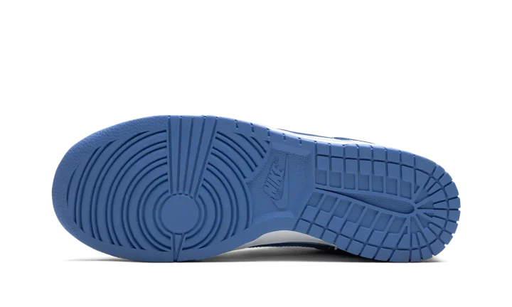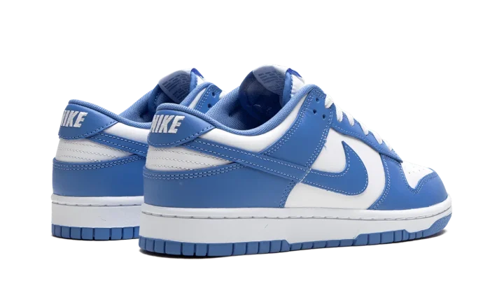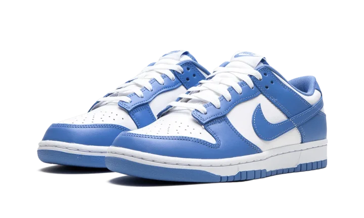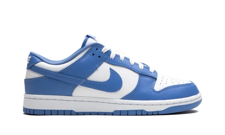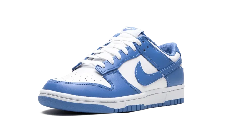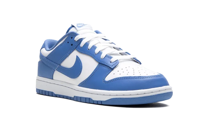 The Nike Dunk Low "Polar Blue" is a colorway of the retro basketball sneaker with a clean two-tone color block highlighted by light blue. Reminiscent of the classic "UNC" colorway, this Dunk has a white leather base and Polar Blue leather overlays. A Polar Blue leather Swoosh appears on the mid-panel. "Nike" branding is embroidered on the heel and printed on the tongue. A white midsole and blue outsole complete the look. Release date: October 14, 2023