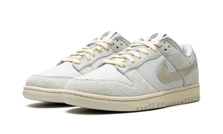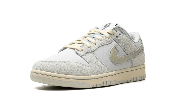 The Nike Dunk Low "Gone Fishing" is a colorway of the retro basketball and casual shoe with a fish-inspired appearance. Also known as the "Chinook Salmon" colorway, this Dunk Low features an eye-catching design with iridescent scaled Swooshes, including a "tooth" appearing at the top of the Swoosh on the lateral side. As for the rest of the shoe, the base is made from a Photon Dust ballistic nylon base. Tonal suede overlays add another visual appeal to the sneaker. Fish detailing is printed on the tongue tag and insole. The cream rubber midsole and matching laces give the design a vintage look. Release date: June 16, 2023