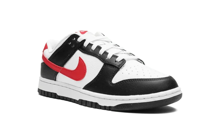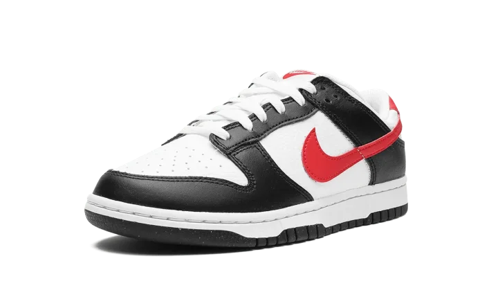 The Nike Dunk Low "Red Swoosh Panda" is a colorway of the vintage basketball shoe with fiery red branding. The "Red Swoosh Panda" updates the Dunk Low with a versatile color scheme that pairs a white leather base with black leather overlay panels. A University Red leather Swoosh appears on both sides of the shoe. The blazing red accenting is also found on the "Nike" branded heel tab and on the "Nike" detailing on the tongue tag. Underfoot, a white midsole and black rubber outsole complete the look. Release date: October 1, 2022