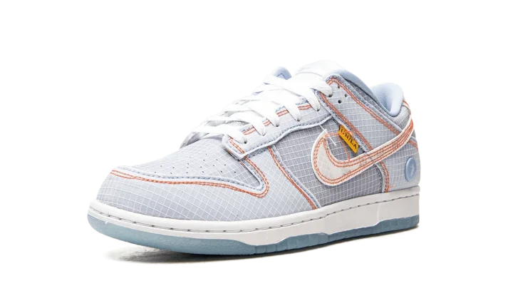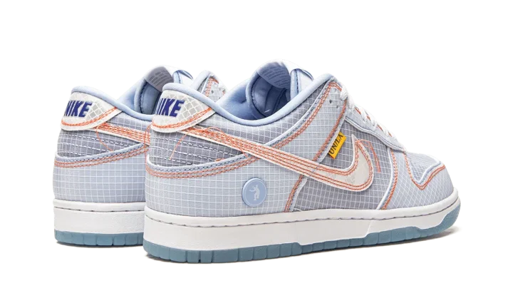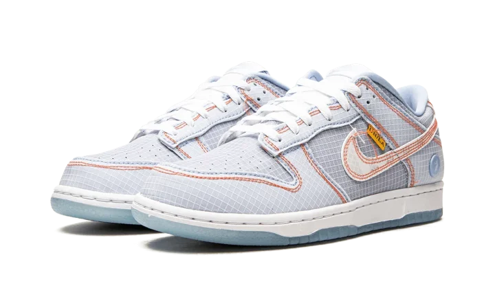 The Union x Nike Dunk Low "Hyper Royal" is a collaboration between Chris Gibbs's Los Angeles fashion boutique and Nike on the vintage basketball shoe. Perhaps best known for its Air Jordan collaborations since the 2010s, Union LA—or just Union for short—is a longtime partner of Nike, having worked with the brand in various instances dating back to the early 2000s. Here, the "Hyper Royal" is one of three colorways of the Dunk from Union's 2022 collaboration with Nike. The shoe features a gridded, ripstop-nylon-like material on its light blue upper. Each overlay is outlined in orange. A small yellow "UN/LA" hang tag appears on the lateral side of the midfoot overlay and the brand's "Halo" skateboarding logo is found on the heel and the forefoot of the outsole. The shoe features additional hang tags that allude to baggage claim tags. Underfoot, a white rubber midsole is paired with an icy, semi-translucent outsole.