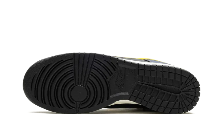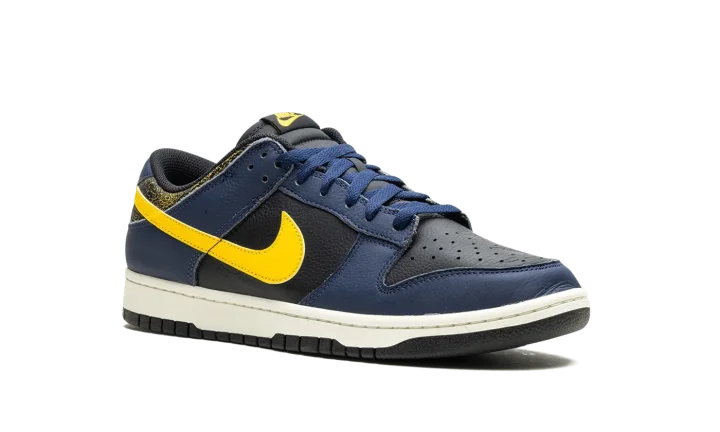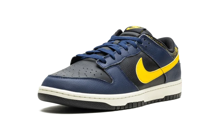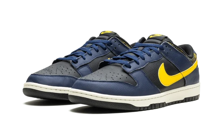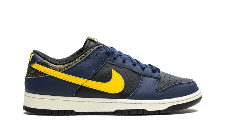 The Nike Dunk Low Vintage "Michigan" is a colorway of the classic basketball shoe with an aged aesthetic loosely inspired by the Michigan Wolverines college basketball team. The Nike Dunk was released in a "Michigan" colorway in 1985 and, here, the shoe informs the colors and design of the Dunk Low Vintage "Michigan." Specifically, the upper has a black leather base and Midnight Navy leather overlays. A Varsity Maize leather Swoosh appears on the sides, while a yellow "Nike" logo is embroidered on the heel. The collar is designed with an aged, cracking aesthetic that suggests the look of prolonged wear. Underfoot, a Sail rubber midsole completes the look. Release date: February 1, 2024