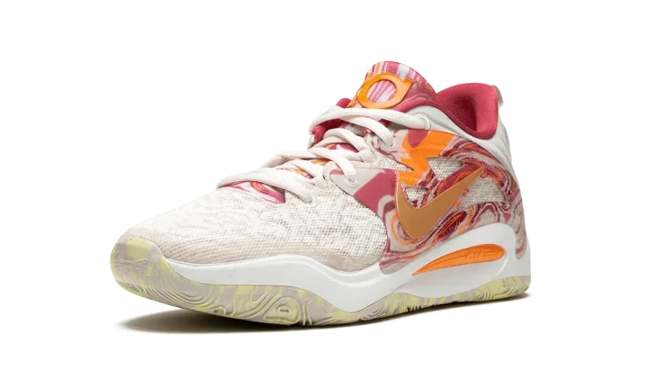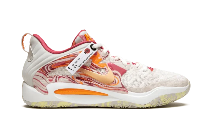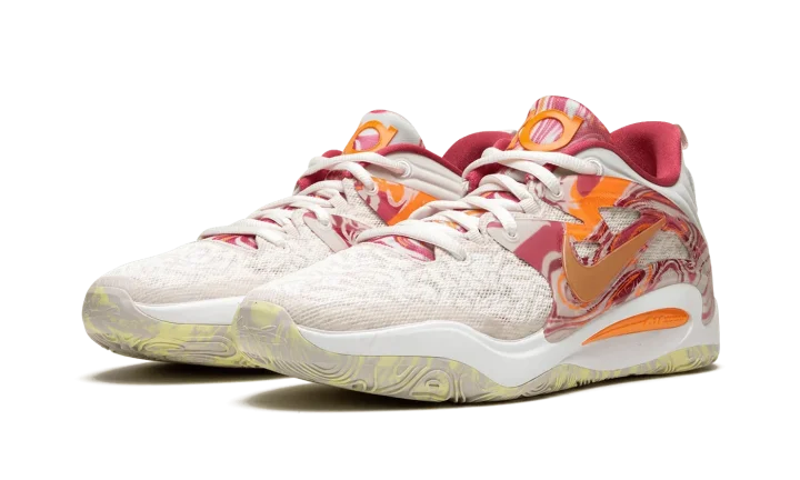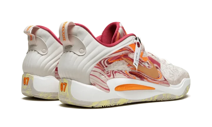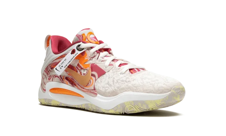 The Nike KD 15 "All-Star" is the special All-Star Game colorway of Kevin Durant's fifteenth signature shoe with Nike Basketball. Succeeding several popular "All-Star" colorways from Durant's signature Nike KD line, the 2023 version of the theme is just as eye-catching as any release from the collection. The shoe features a breathable mesh construction in Light Orewood Brown. A Metallic Gold Swoosh is surrounded by an orange and pink marbled TPU overlay on the sides of the shoe. "KD" branding appears on the tongue. Durant's "07" jersey number, his former number with the Brooklyn Nets, is found on the heel of the marbled rubber outsole. Release date: February 16, 2023
