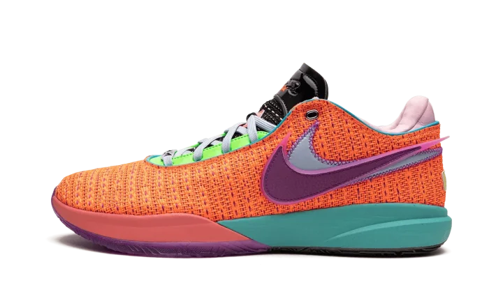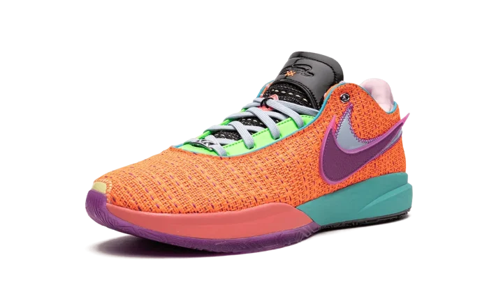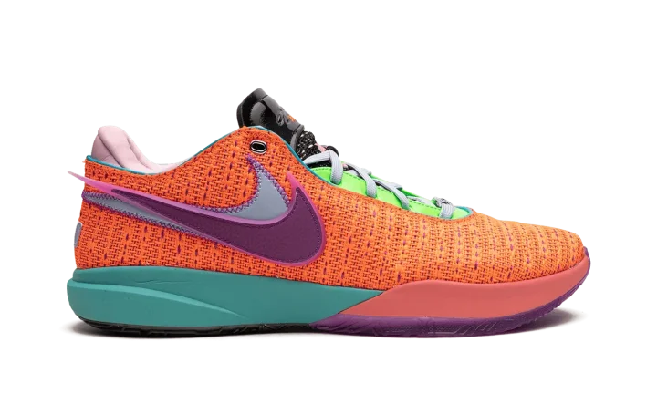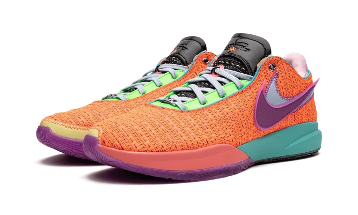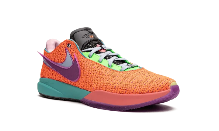 The Nike LeBron 20 "Chosen One" is a head-turning colorway of LeBron James's twentieth signature shoe. The Nike LeBron 20's "Chosen One" colorway is inspired by LeBron's nickname that he earned way back when he was a high school basketball player at St. Vincent St. Mary's in Akron, Ohio. The shoe features a Total Orange mesh design with a Vivid Purple Swoosh layered over a grey Swoosh on either side. A bright neon green overlay is found on the eyelet panel, giving the shoe another eye-catching design element. LeBron's signature Nike branding is found on the tongue.
