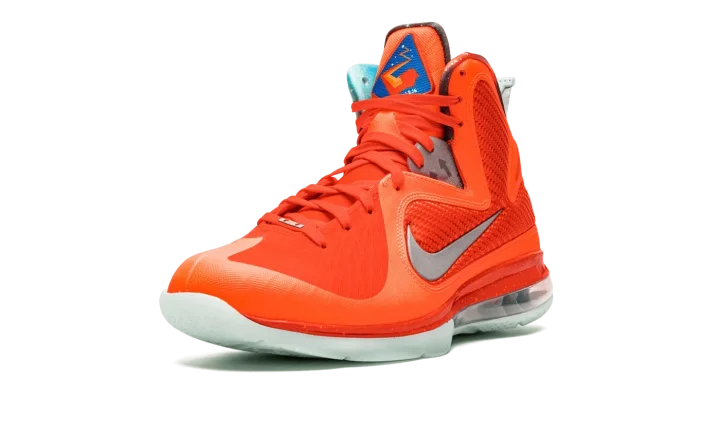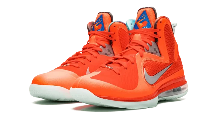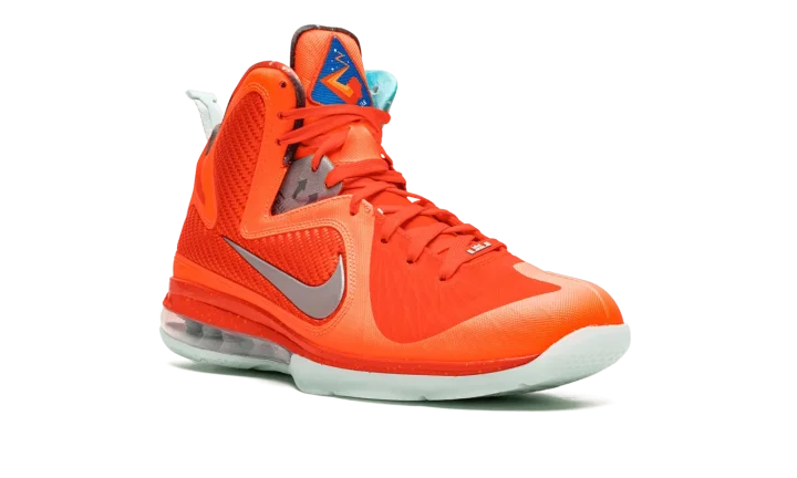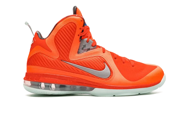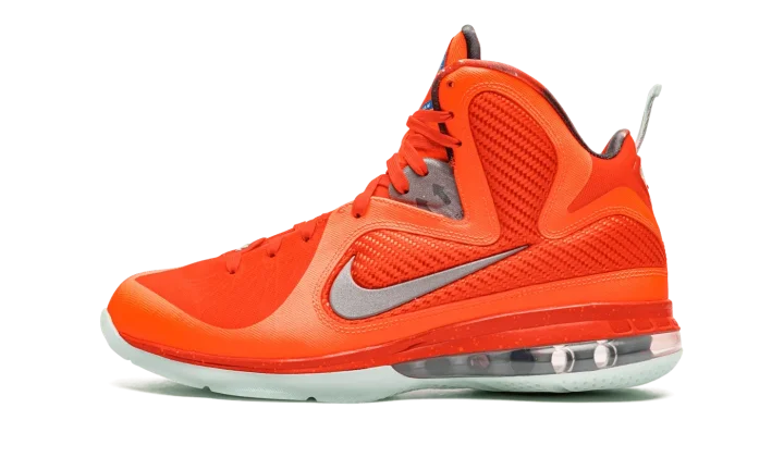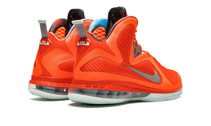 The Nike LeBron 9 "Big Bang 2022" is the February 2022 re-release of the head-turning colorway of LeBron James's ninth signature shoe that was originally released over NBA All-Star Weekend in 2012. The original "Big Bang" Nike LeBron 9 was one of multiple All-Star colorways by Nike included in the famous "Galaxy" collection that also contained the rare, ultra desirable Nike Air Foamposite One "Galaxy." Inspiration for the "Big Bang" and the "Galaxy" collection came from the Kennedy Space Center, NASA's headquarters in Florida which is located near Orlando, the site of the 2012 All-Star Game. The modern "Big Bang" is a near one-to-one remake of the original colorway. The shoe features a Total Orange mesh construction with a contrasting reflective Swoosh on the sides. The translucent glow-in-the-dark outsole sits beneath a large visible Air bubble on the heel. "Galaxy" print on the interior lining to complete the look. Release date: February 18, 2022