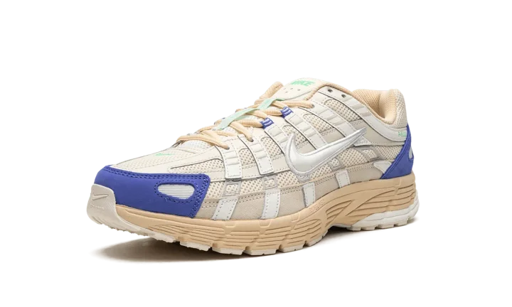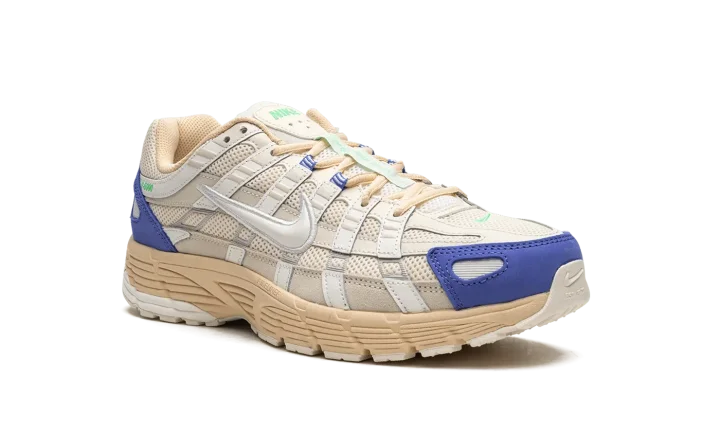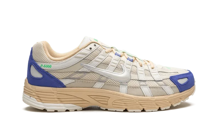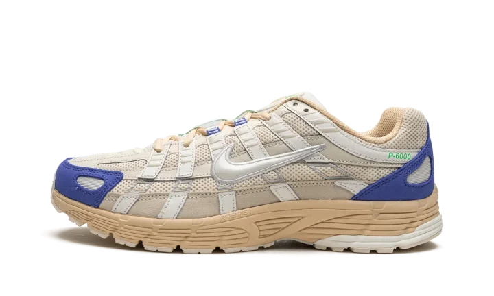 The Nike P-6000 "Athletic Department" is a special colorway of the shoe that combines style elements from the Nike Pegasus 25 and 2006. Heavily inspired by the 2000s era of running shoes, the Nike P-6000 has a retro yet modern appearance that lends itself to casual wear in today's sneaker landscape. The shoe's design features a cream mesh base with tonal and white leather overlays. A white Swoosh logo is located on either side of the shoe. Blue detailing appears on the toe overlay and green accenting is found on the "Nike" logo hit and overlay on the tongue. Release date: March 1, 2023