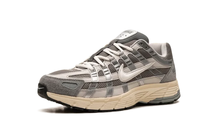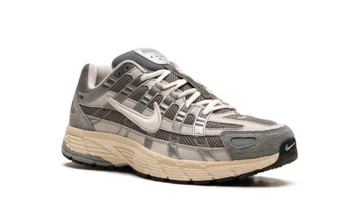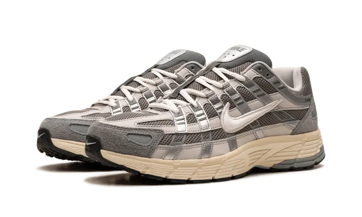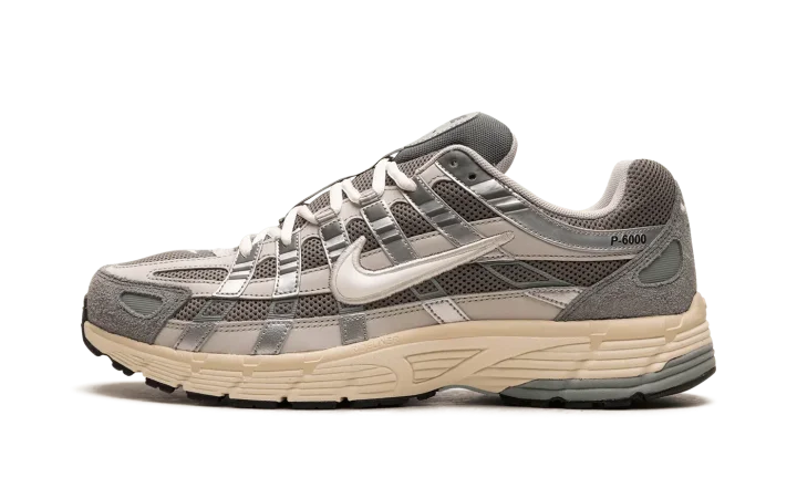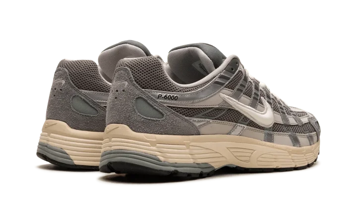 The Nike P-6000 "Flat Pewter" is a greyscale colorway of the shoe with a design inspired by the Nike Pegasus 25 and 2006. Inspired by the 2000s era of running shoes, the P-6000 has a retro-meets-modern appearance that's ideal for casual wear. The shoe's design features a light grey mesh base with tonal leather overlays. A white Swoosh logo is located on each side of the shoe. The cream foam midsole adds contrast to the predominantly grey upper. Release date: November 18, 2023