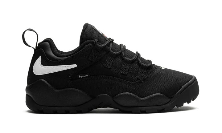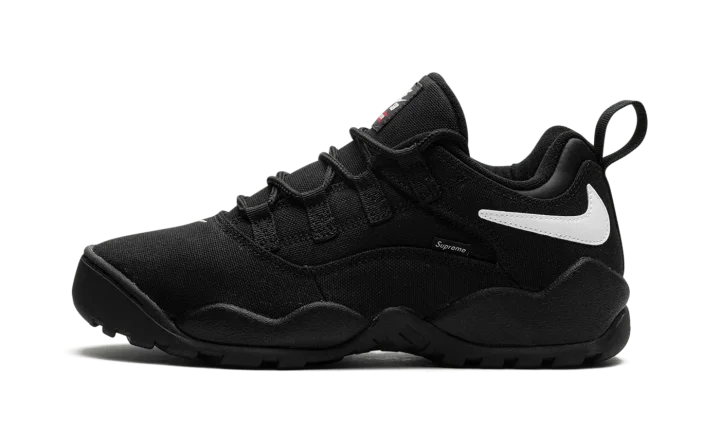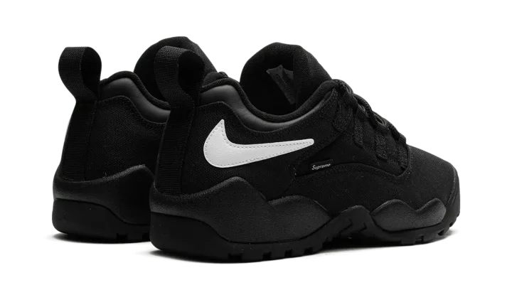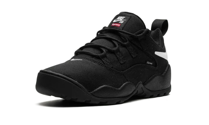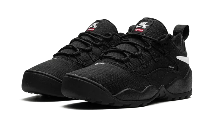 The Supreme x Nike SB Darwin Low "Black" is a collaboration by the "World Famous" streetwear brand on a versatile colorway of the retro skate and basketball shoe. The Nike Darwin was designed by legendary Nike footwear designer Tinker Hatfield and worn by Dennis Rodman in the NBA before it became indoctrinated into the skateboarding world thereafter. Supreme and Nike SB team up to bring back the classic 1990s-era shoe with skate-friendly updates. The "Black" colorway features a black canvas construction with a white reversed Swoosh on the collar. A "Supreme" branded tag is seen on the lateral side of the shoe. Co-branding appears on the tongue.