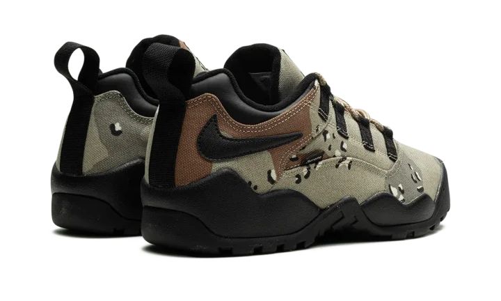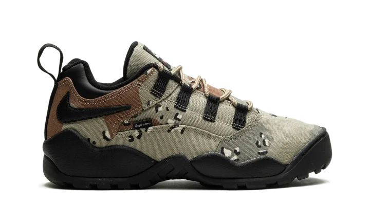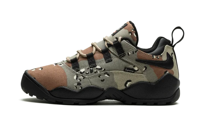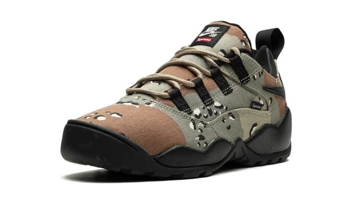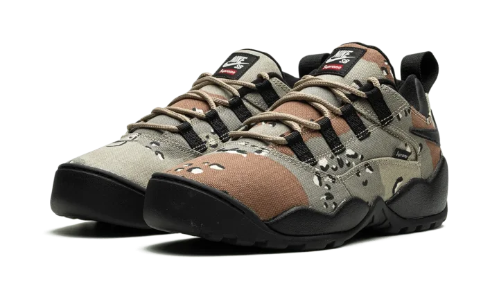 The Supreme x Nike SB Darwin Low "Camo" is a collaboration by the New York based streetwear brand on a bold colorway of the retro sneaker. The Nike Darwin was designed by legendary Nike footwear designer Tinker Hatfield and worn by Dennis Rodman in the NBA. Supreme and Nike SB team up to bring back the classic 1990s-era shoe with skate-friendly updates. The "Camo" colorway features a desert camo pattern across the canvas upper in a tan, brown, green, and black color scheme. A small black Swoosh appears on the toe and a "Supreme" branded tag is seen on the lateral side of the shoe. Dual "Supreme" and "Nike SB" detailing appears on the tongue tag.