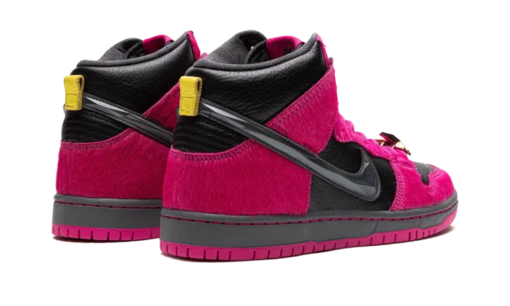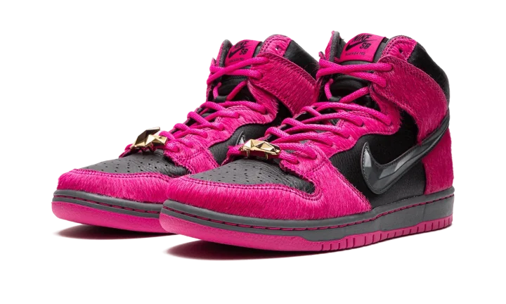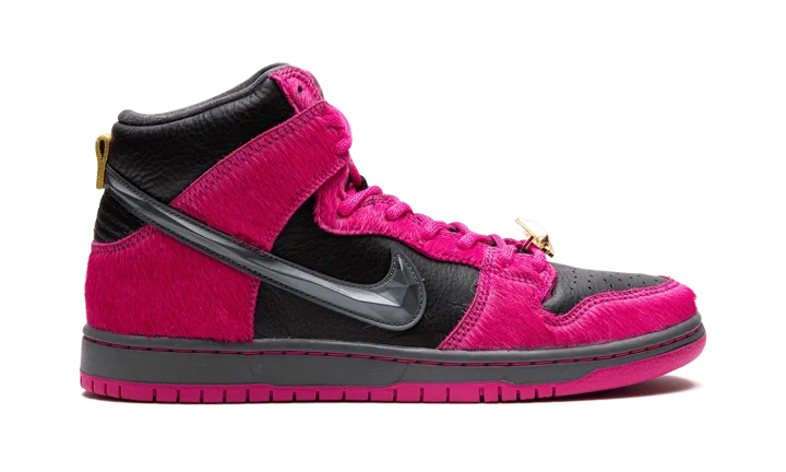 The Run the Jewels x Nike SB Dunk Low "Active Pink" is a collaboration by the popular hip-hop duo of El-P and Killer Mike on the iconic skate shoe. Run the Jewels is one of the most influential rap groups of all time, and on the "Active Pink" colorway, the pair gives the venerable SB Dunk an eye-catching look. The shoe features a black tumbled leather base with contrasting Active Pink faux pony hair overlays. A black sculpted Swoosh appears on the sides and gives the shoe an upscale look. "Run the Jewels" branding is inscribed on the inner side of the tongue. A flashy gold lace dubrae is attached to the laces. Release date: April 20, 2023