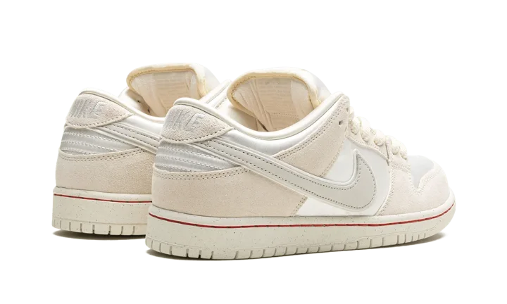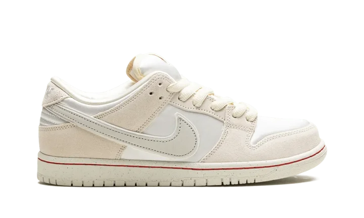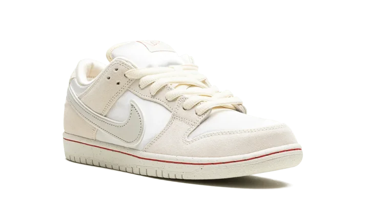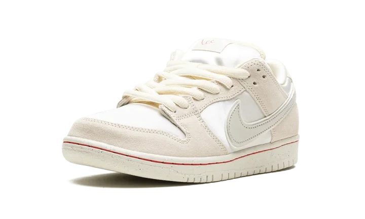 The Nike SB Dunk Low "Valentine's Day - Low Love Found" is a colorway of the retro skateboarding shoe from the collection that draws inspiration from the "Red Thread of Fate" mythology. The shoe has a minimalist design with a combination of Coconut Milk leather and Light Bone suede panels, respectively. A Light Bone leather Swoosh appears on either side of the shoe. Classic "Nike" branding is embroidered on the heel. A red string is woven into the design of the "Nike SB" detailing found on the tongue tag, a nod to the symbol of enduring connection represented by the red thread of fate. Release date: February 14, 2024