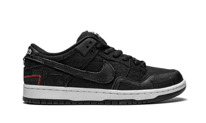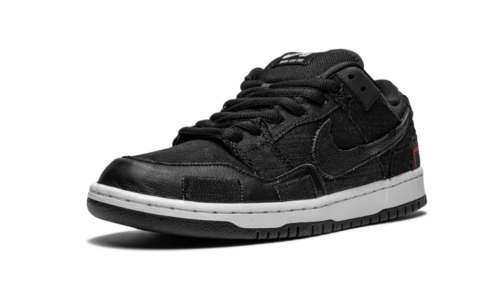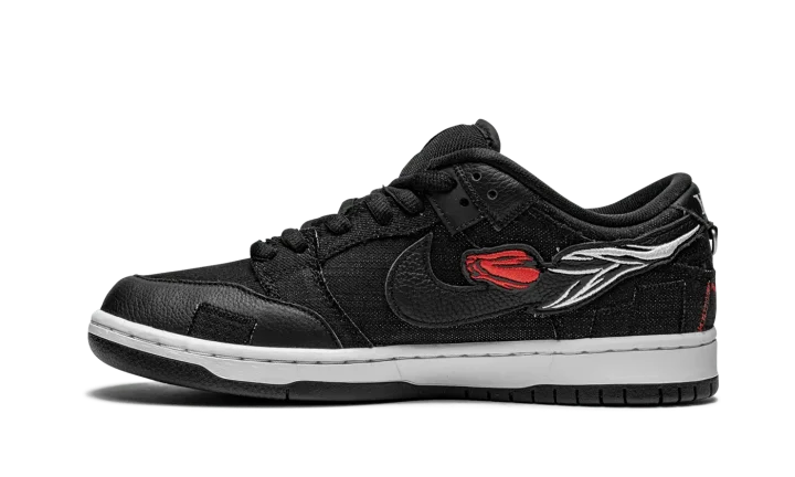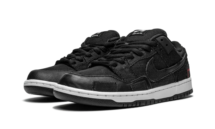 The Wasted Youth x Nike SB Dunk Low is a punk inspired collaboration between streetwear designer Verdy and Nike SB on the low-top skate shoe. Wasted Youth, which precedes the Japanese designer's Girls Don't Cry streetwear imprint, was revived for this limited edition colorway of the SB Dunk Low and, true to its nickname, the look is wholly influenced by the rebellious spirit of punk rock. The upper's washed black denim base features a decidedly pre-worn look with fraying and unfinished edges on each panel. A frayed black tumbled leather Swoosh logo appears on the lateral side and an embroidered red rose motif is incorporated into the design of the Swoosh branding on the medial side. Red contrast stitching can be found on the back of the shoe beneath the silver metallic hoops that are hooked into the leather branding patch on the heel. The slogans "Wasted" and Youth" are embroidered on the back of the left and right shoe, respectively. Verdy and Nike SB add a patchwork-like leather and denim overlay to the forefoot of each shoe. Mismatching white and black Nike SB branding can be found on the right and left tongue tags, as well. Zoom Air cushioning is embedded within the midsole for all-day comfort. Release date: April 6, 2021.