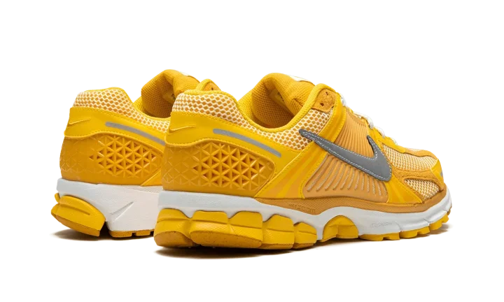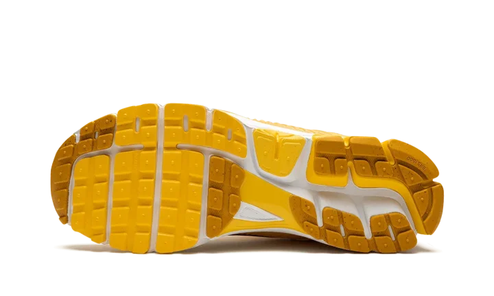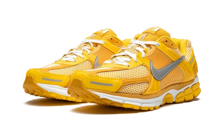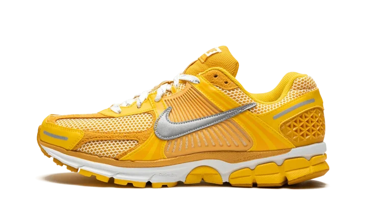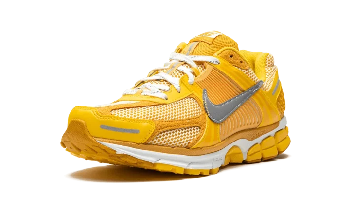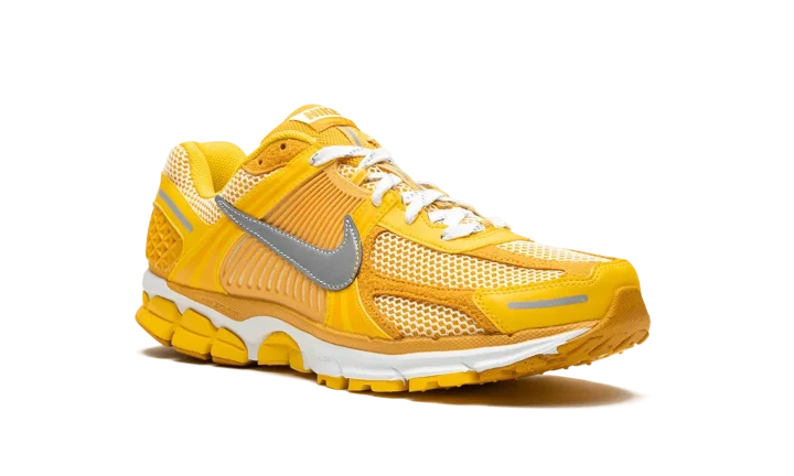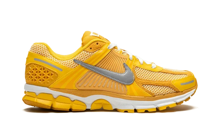 The Nike Zoom Vomero 5 "Varsity Maize" is a head-turning yellow colorway of the classic performance shoe that was originally released in 2010. The Zoom Vomero 5 was re-introduced as a lifestyle shoe via a collaboration with Samuel Ross's *A COLD WALL clothing brand in 2018, and again beginning in 2022 thanks to colorways like the "Varsity Maize." The upper features a white mesh construction in Laser Orange with Varsity Maize overlays throughout the design. A Metallic Silver leather Swoosh appears on both sides of the shoe. "Nike Vomero 5" branding is found on the tongue. The shoe features Zoom Air cushioning within its foam midsole for all-day comfort.