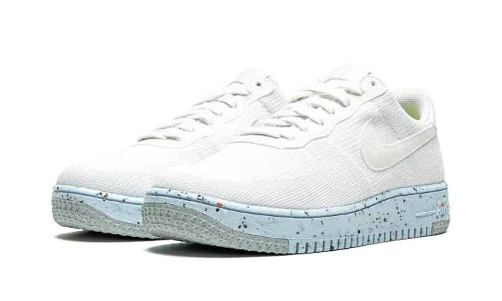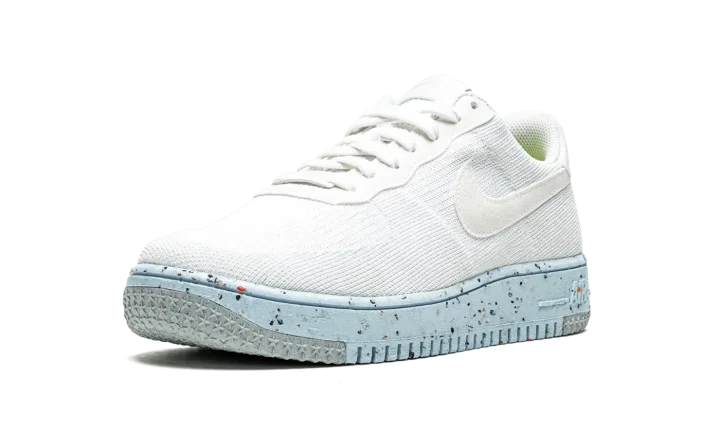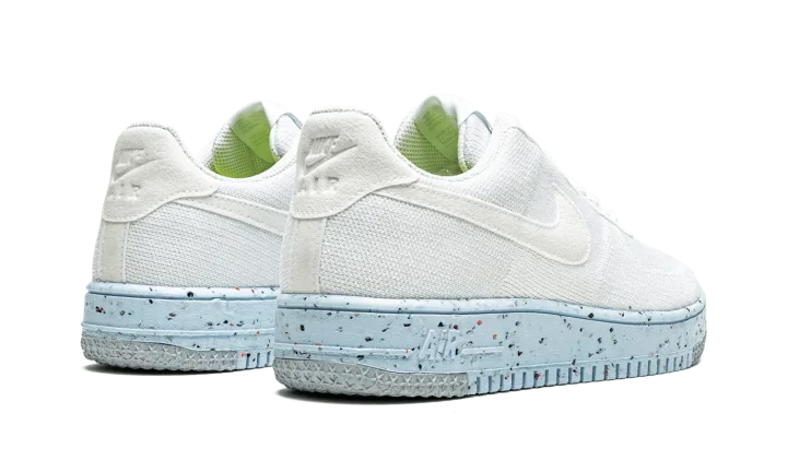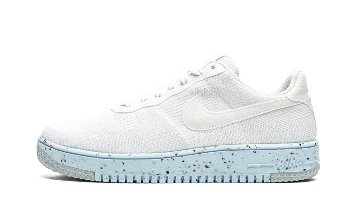 The Women's Nike Air Force 1 Crater Flyknit "White" is a modern take on the classic basketball shoe that updates the silhouette with environmentally friendly materials. Ultra lightweight, the shoe's upper is composed of Nike's Flyknit material that's both durable and breathable in design. A suede Pure Platinum Swoosh appears on either side and embossed "Nike Air" with a Swoosh branding graces the suede heel tab. The Air Force 1 Crater Flyknit for women rides on a speckled Crater foam midsole that's composed of Nike's "Grind" material.