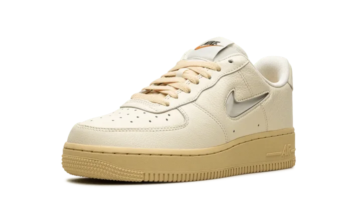 The Women's Nike Air Force 1 Jewel "Coconut Milk" is a women's version of the retro basketball shoe in a colorway with a unique jeweled Swoosh. In the "Coconut Milk" colorway, the Air Force 1 Jewel features a cream-colored leather construction with tonal leather overlays. A Bone-tinted Jewel Swoosh logo appears on either side of the shoe. "Nike Air" branding is embroidered on the heel. Additional branding in the form of "Nike" and orange Swoosh logos appear on the white nylon tongue tag. A Coconut Milk rubber midsole with tonal "Air" insignia completes the look.