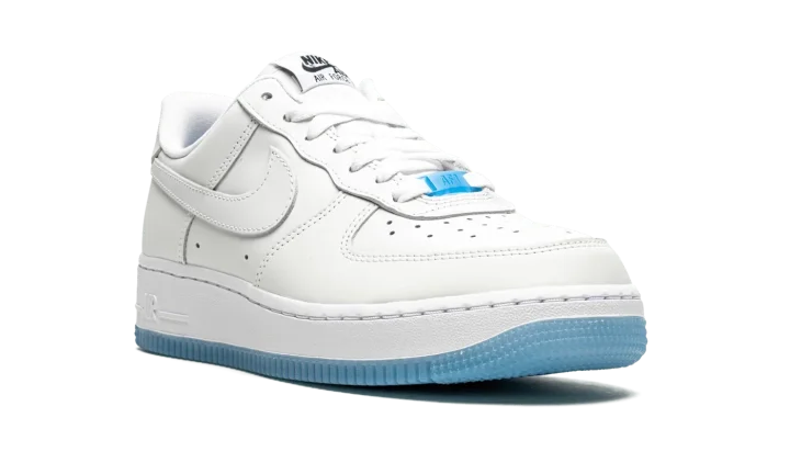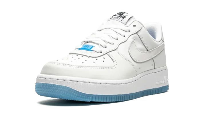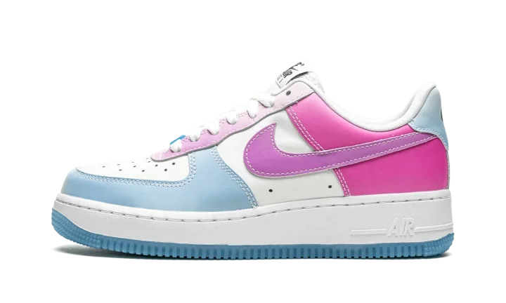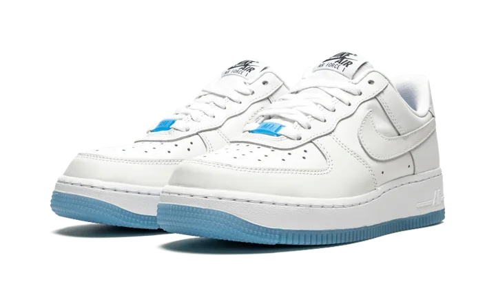 The Women's Nike Air Force 1 Low "UV Reactive" is a women's exclusive look for the retro basketball shoe that features photochromic inks that give the shoe a new multicolor look when exposed to UV light. It appears as a variation of the Air Force 1's "White on White" colorway when not in contact with UV rays. When exposed, the forefoot, eyelets, mid-panel, collar, and heel adjust into various shades of pastel colors. Specifically, the perforated toe and mid-panel turn yellow while the forefoot, eyelets, collar, and Swoosh transition from white to light blue, purple, and pink, respectively. A white midsole is paired with an icy translucent blue outsole. A Silicone Swoosh hang tag accompanies the shoe.
