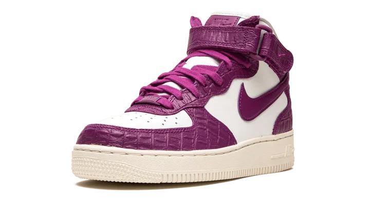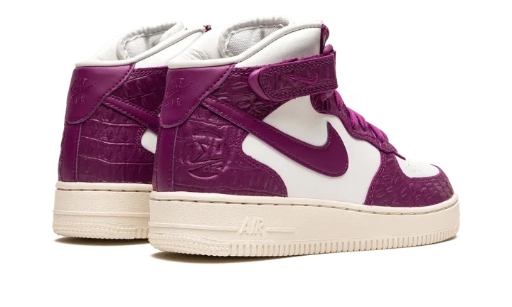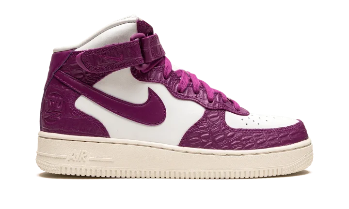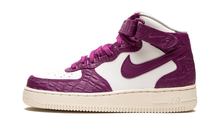 The Women's Nike Air Force 1 Mid "Tokyo Viotech" is a women's-exclusive colorway of the classic basketball and lifestyle shoe with a decidedly luxurious design. The "Tokyo Viotech" updates the Air Force 1 Mid with faux reptilian leather overlays in a rich magenta hue called Tokyo Viotech. The leather Swoosh branding that is found on either side of the shoe is also rendered in the same shade of magenta. Additional "Nike Air" detailing is debossed tongue tag.