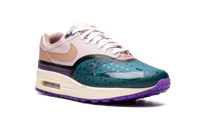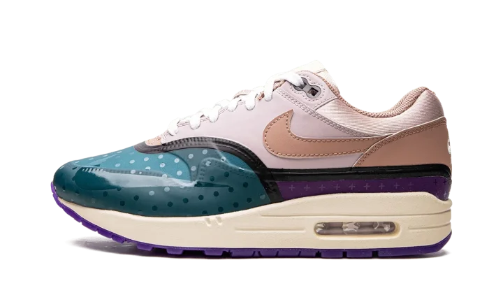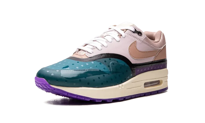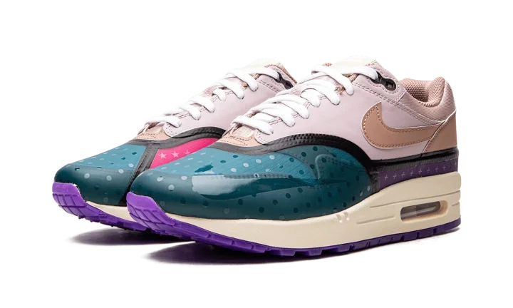 The Women's Nike Air Max 1 "Mini Symbols" emerges in a premium, multi-color ensemble covered in miniature symbols. This sneaker features an arrangement of leather, synthetic Hyperfuse and mesh materials coming together throughout the upper in a refreshing layout. Shades of teal, purple, pink and blue for the Hyperfuse panels feature glossy patterns of dots, stars and other symbols for a unique look. An off-white midsole and translucent purple rubber outsole complete this intriguing take on the classic running shoe.