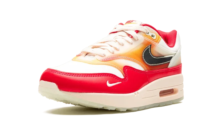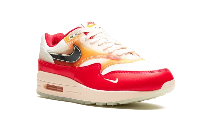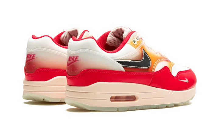 The Women's Nike Air Max 1 "Soft Vinyl" is a women's-exclusive colorway of the retro performance running shoe inspired by the soft vinyl collectible toys that are popular in Japan. Also known as the "Sofvi" colorway, the shoe features a Sail mesh base with punchy Siren Red-colored leather overlays. An orange-and-pink color scheme appears in an ombre-like design on the overlays on the mid-panel and mudguard. Chrome Swoosh branding and a graphic sockliner enhance the look, as do the glow-in-the-dark elements throughout the design. Release date: August 30, 2023