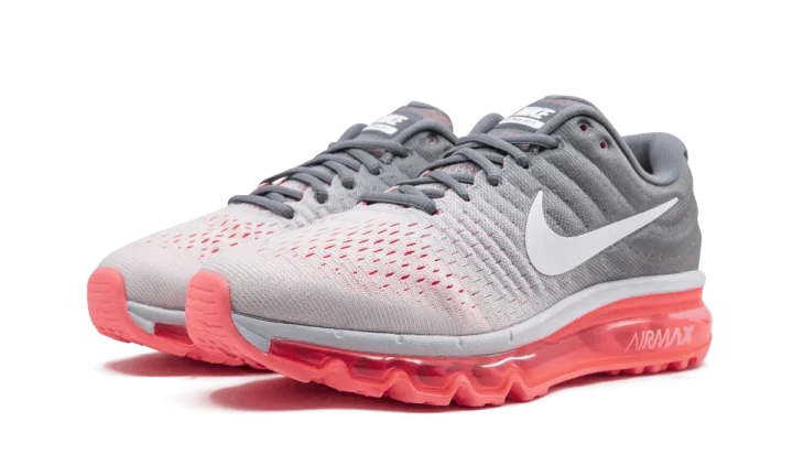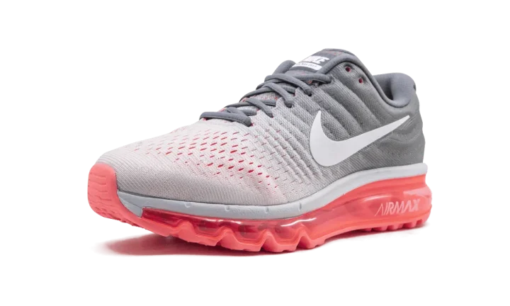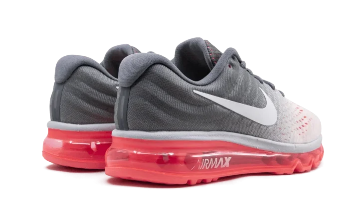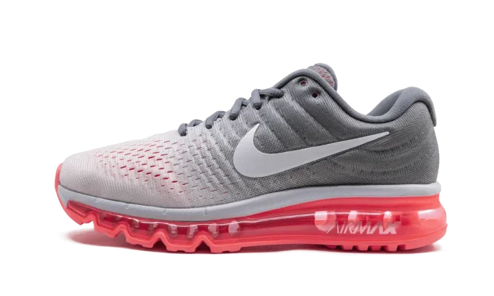 The Nike Air Max 2017 extends the Swoosh brand's iconic Air Max legacy with another women's style. This 2017 model of the Air Max is created with an engineered mesh upper for a flexible but supportive fit, while the midsole consists of a full-length oversized Air unit. A white to grey gradient covers the upper, and stark white accents the Nike Swoosh, tongue badge, and midsole. A punchy pink translucent outsole rests below the cushioning unit.