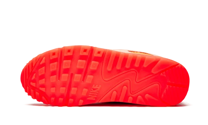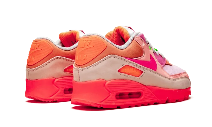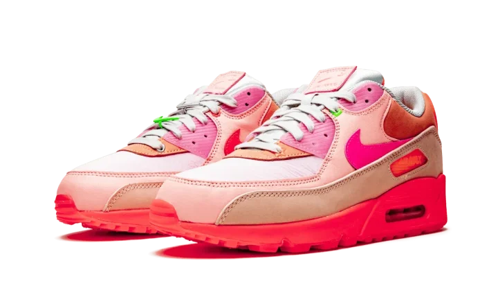 The Nike Air Max 90 is a women's silhouette that's not just pretty in pink. It's pretty in violet, red, orange, and a lot of other colors. The suede and leather upper with rubber overlays is graced with panels of the aforementioned vibrant hues — and the result is a daring neon look. The platinum silver tongue and sockliner and tan mudguard add lighter variations to the color scheme that are neutral in comparison. Completing the statement sneaker is a monochromatic crimson midsole with a visible Air Max bubble.