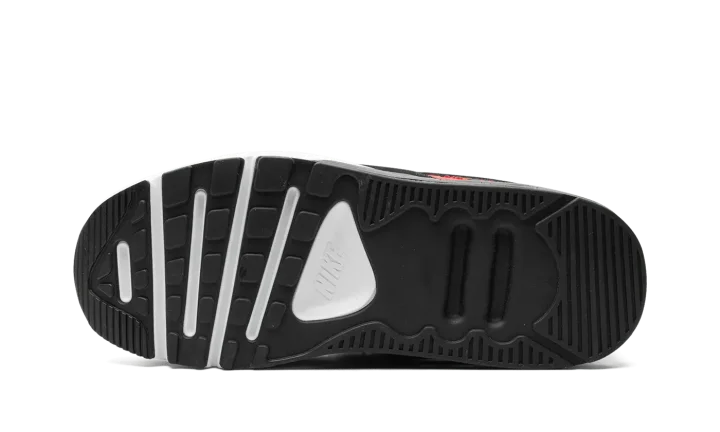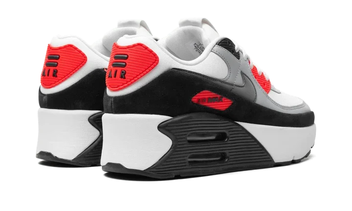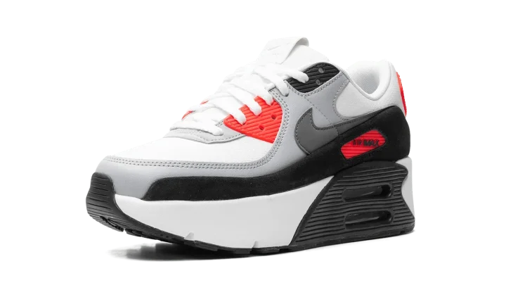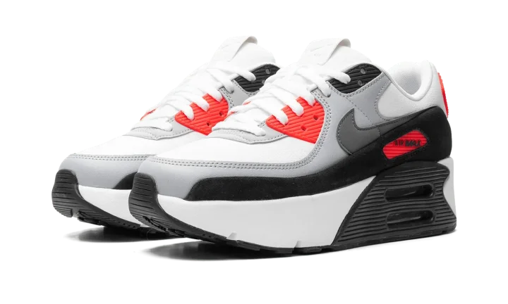 The Women's Nike Air Max 90 Double Stacked "Infrared" is a women's-exclusive colorway of the retro running shoe with a platform-style sole. The Nike Air Max 90 Double Stacked updates the Air Max 90's classic design with double-stacked Air units in the heel of the midsole, giving the classic shoe a contemporary look. On the "Infrared" colorway, the shoe features a white textile base and a grey synthetic nubuck mid-panel overlay. An Infrared colored "Air Max" branding window appears on the lateral side of the black leather mudguard, while a smokey Swoosh logo can be seen on both sides of the shoe. A modified "Air" logo appears on the Infrared-colored heel counter, while a debossed "Nike Air" logo can be found on the tongue. As mentioned above, the shoe has stacked Air cushioning units in the heel of the midsole that add a boost in height to the wearer.