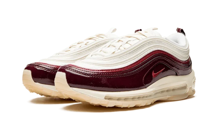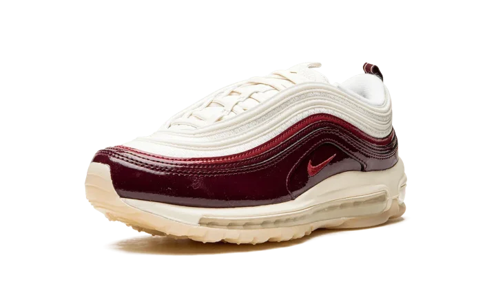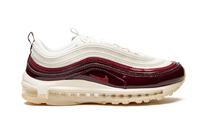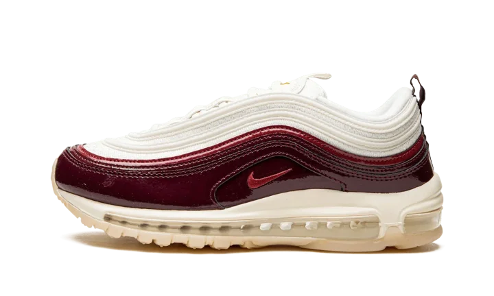 The Women's Nike Air Max 97 "Dark Beetroot" is a women's-exclusive colorway of the vintage running shoe designed with versatility in mind. The lifestyle-focused "Dark Beetroot" Air Max 97 for women features a Sail-colored mesh base with tonal leather panels. The mudguard is designed in Dark Beetroot-colored patent leather. A maroon patent leather wavy panel separates the cream overlays and dark red mudguard. Dark Beetroot embroidered Swoosh branding is found on either side of the shoe above the Sail foam midsole. A full-length Max Air cushioning unit under the midsole provides all-day comfort.