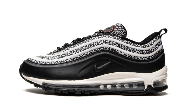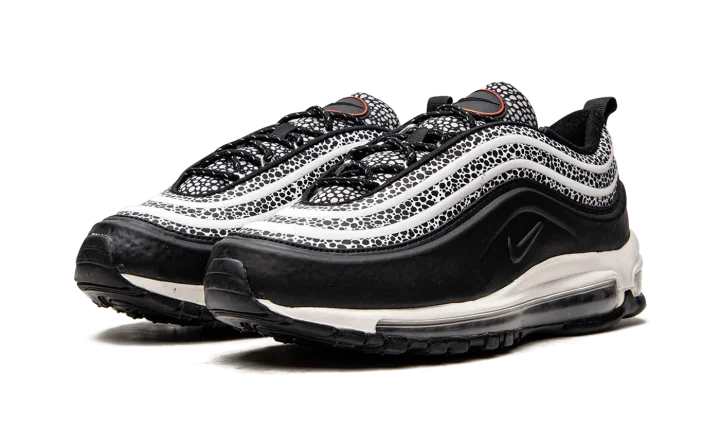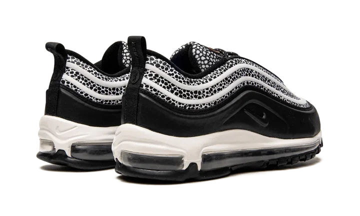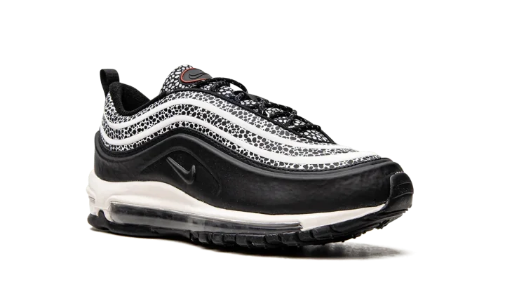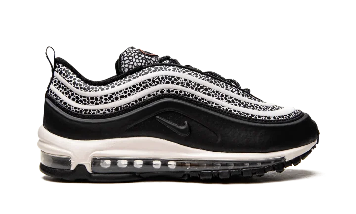 The Women's Nike Air Max 97 "Safari" brings a wild, head-turning look to the classic running shoe. This Air Max 97 features a flashy black-and-white safari print that constitutes much of the upper and insoles. The leather and/or mesh that is usually present on the mudguard is replaced with a rubbery black material, which is complemented with a subtle hit of red to the tongue and reflective flair on the laces. Underneath sits the full-length Air Max unit that the Air Max 97 is famous for.