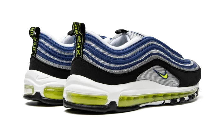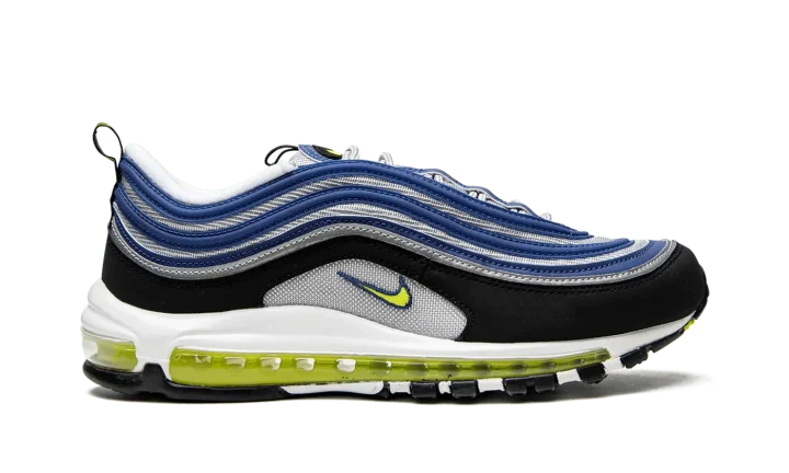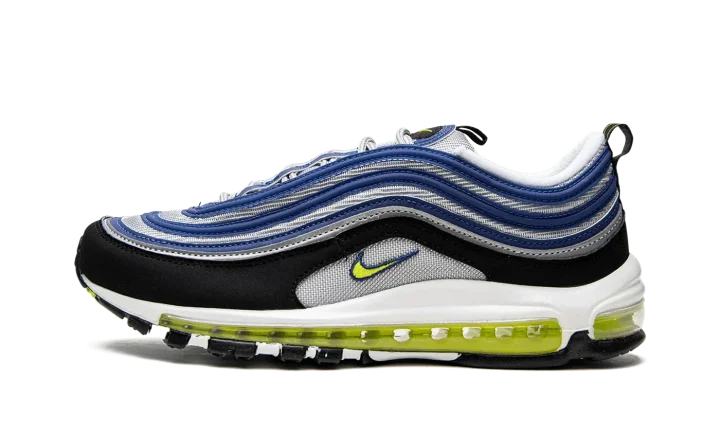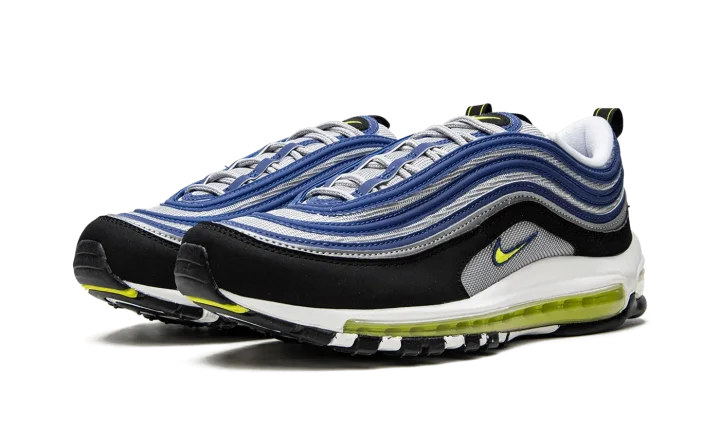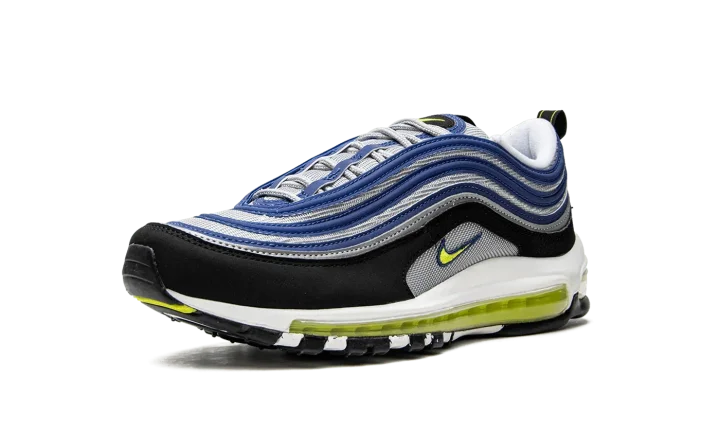 The Nike Air Max 97 "Atlantic Blue/Voltage Yellow" is a colorway of the retro performance running shoe that combines its original "Atlantic Blue" and "Neon" colorways. In 2017, Nike reissued the Air Max 97's "Atlantic Blue" and "Neon" colorways for the models 20th anniversary, and here, the Swoosh combines both classic styles into one cohesive colorway for the shoe's 25th anniversary. The "Atlantic Blue/Voltage Yellow" has blue reflective leather panels layered over a Metallic Silver mesh base on the upper. A black mudguard contrasts the look. A Voltage Yellow Swoosh is embroidered on either side above the white foam midsole. Additional neon yellow accents can be found on the Swoosh on the tongue and on the black nylon heel tab. The full-length visible Air cushioning system within the white foam midsole is consistent with the original design of the Air Max 97. Release date: August 23, 2022