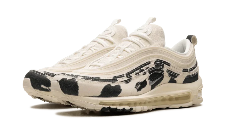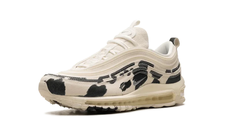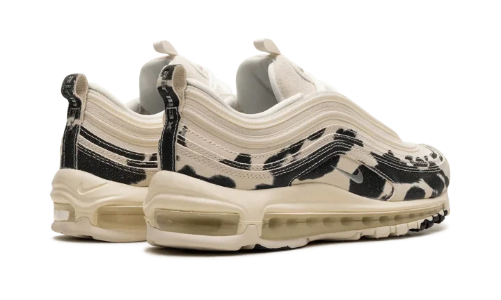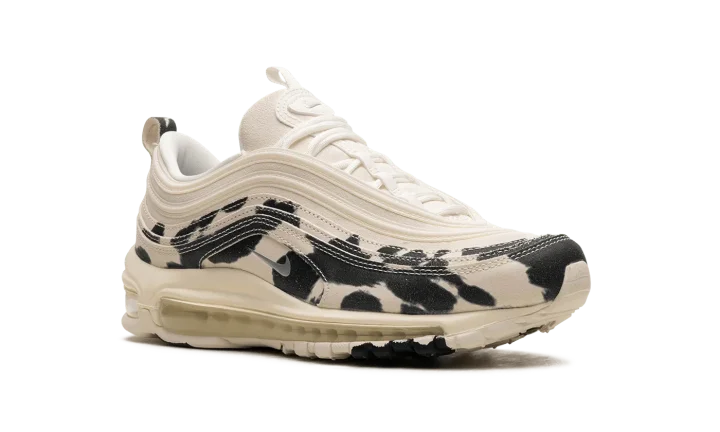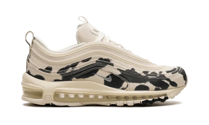 The Women's Nike Air Max 97 "Cow Print" is a women's-exclusive colorway of the retro performance running and lifestyle shoe with unique cow print on its design. Released in 1997, the Air Max 97 has been beloved by generations of enthusiasts who have come to appreciate the model's sleek design and comfort. Here, the "Cow Print" colorway features an eye-catching cow print pattern on the shoe's wavy suede overlays and suede mudguard. Classic Air Max 97 branding elements are seen on the nylon heel tab and tongue. A full-length visible Air cushioning unit in the midsole sits above the rubber outsole, the latter which also receives a cow-spot treatment. Release date: June 3, 2023
