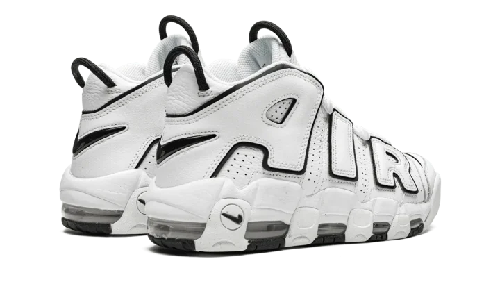 The Women's Nike Air More Uptempo "White/Black" is a women's-exclusive version of the '90s basketball shoe in a versatile white and black colorway. The upper features large "AIR" branding outlined in black that brings a '90s-style, graffiti-inspired look to the table. A black jeweled Swoosh is found on the heel and a black Swoosh is embroidered on the toe. A black Swoosh appears on the tongue. The shoe's upper is constructed in perforated white leather. Two pull tabs on the tongue and heel provides easy on/off wearability. Underfoot, visible Air bubbles in the midsole finish off the look. Release date: March 1, 2022