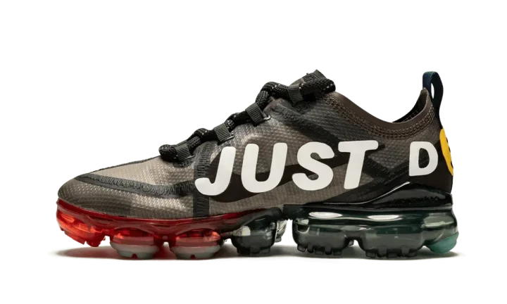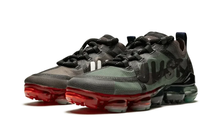 The Cactus Plant Flea Market x Nike Air VaporMax puts a unique spin on the 2019 iteration of the VaporMax. CPFM, the mysterious, Pharrell Williams-adjacent streetwear brand known for its bold and often playful graphic designs, lends their distinct aesthetic to the VaporMax 2019 for this special construction. It features a black-tinted translucent upper emblazoned with large 3-D "JUST DO IT" text, as well as green tubing molded into the shape of a Swoosh. The brand's signature four-eyed smiley face adorns each heel. Other unique details include extra thick laces with reflective accents, a red-to-black gradient tint on the VaporMax unit, and graphic insoles with a thermal map motif. The limited edition Cactus Plant Flea Market x Nike Air VaporMax released on May 14, 2019.