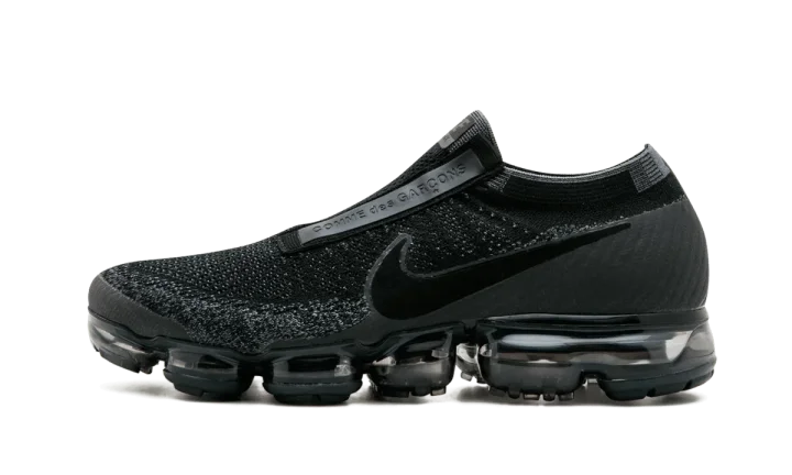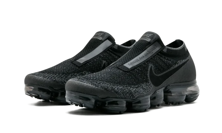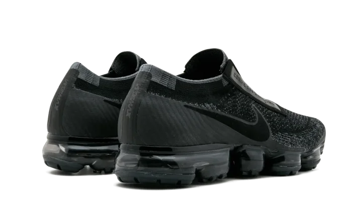 The debut of the Air VaporMax silhouette was quickly followed by the first-ever collab using silhouette with the help of French brand COMME des GARÇONS; together the two deliver a lace-less version of the VaporMax for women. The COMME des GARÇONS x Nike Air VaporMax FK arrived in two colorway options designed by CDG founder Rei Kawakubo: a murdered-out all-black motif and a futuristic silver look. Here we see the former, featuring a slip-on construction, with CDG branding on the lateral and medial sides where the laces would normally appear. The heel features a fused overlay. And finally, you can't miss the full-length VaporMax air unit.