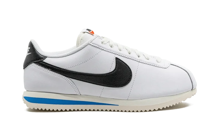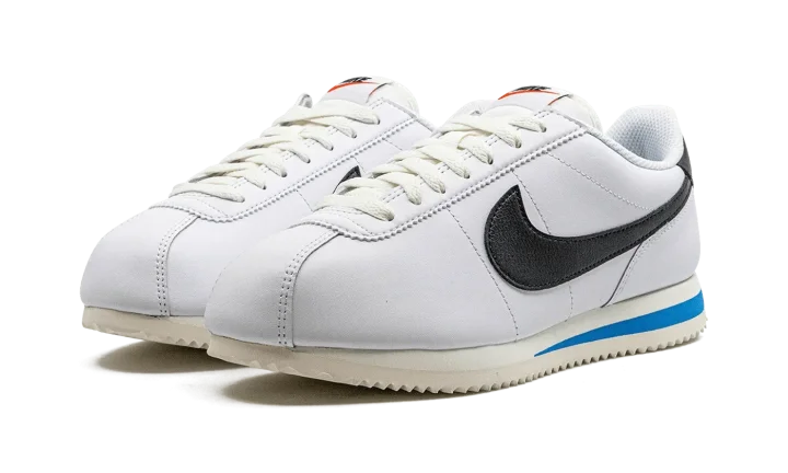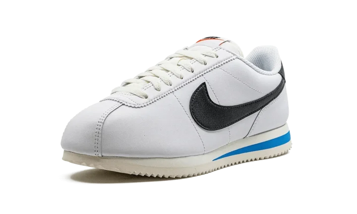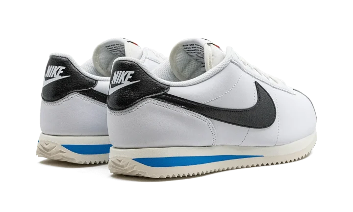 The Women's Nike Cortez "White/Black/Light Photo Blue" is a women's-exclusive colorway of the retro performance running shoe with a classic look. The shoe features a white leather construction with a black leather Swoosh on both sides. "Nike" and Swoosh logos appear on the black leather heel tab. Additional "Nike" detailing is seen on the tongue tag. A Light Photo Blue streak is seen in the off-white midsole. Release date: July 14, 2023