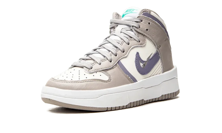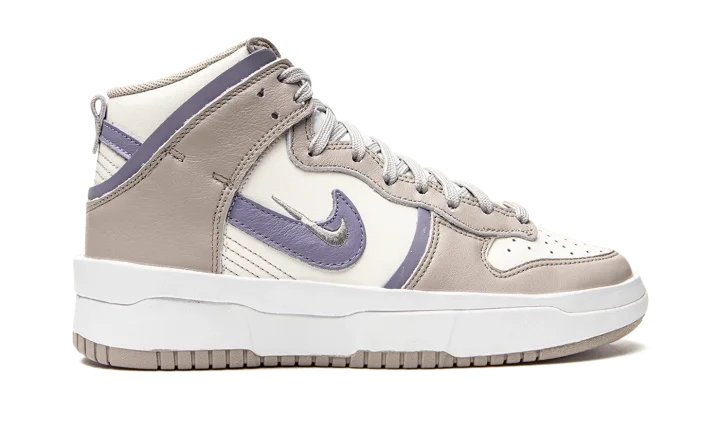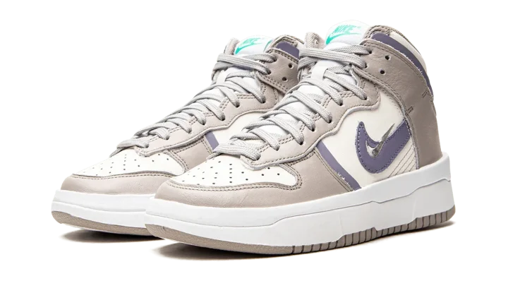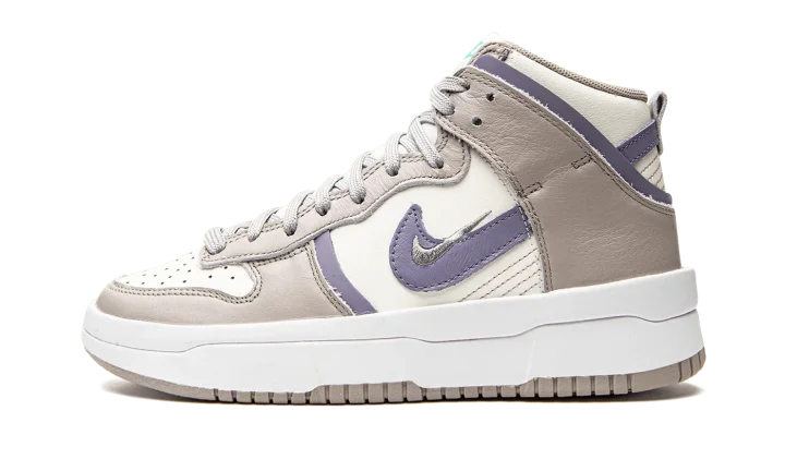 The Women's Nike Dunk High Rebel "Iron Purple" is an August 2021 release of the updated version of the retro basketball shoe by Nike. This adventurous look for Nike's Dunk Rebel model is complete with layered light tan and purple leather panels over a Sail leather base. A small silver Swoosh is embroidered over lavender Swoosh on both sides of the shoe. Turquoise "Nike" and Swoosh branding can be found on the tongue tag on the white nylon tongue. Additional details include Iron Purple laces, a layered white rubber midsole, and tan outsole. Release date: August 28, 2021
