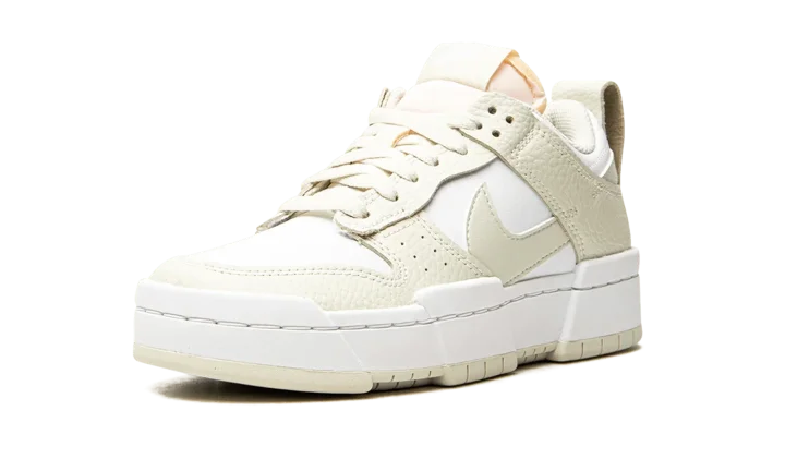 The Women's Nike Dunk Low Disrupt "Sea Glass" is a women's-only colorway of the modified version of the vintage basketball shoe that is based loosely on the Nike Air Train from 1984. The Dunk Low Disrupt debuted in 2020 and was established as a casual, lifestyle-oriented shoe. On the "Sea Glass," the toe, mid-panel, and collar appear in crisp white leather. Sea Glass tumbled leather can be found on the shoe's overlays and Swoosh, which is partially hidden by the tonal leather collar. An exaggerated midsole with "cutouts" at the forefoot, midfoot, and heel completes the look.