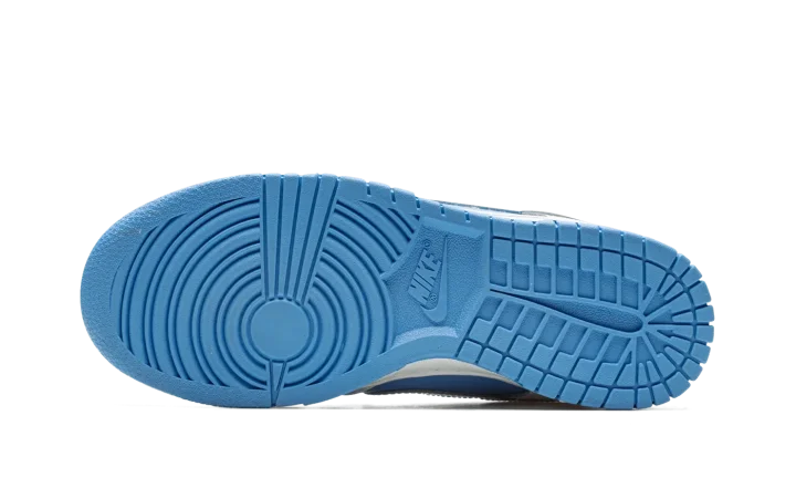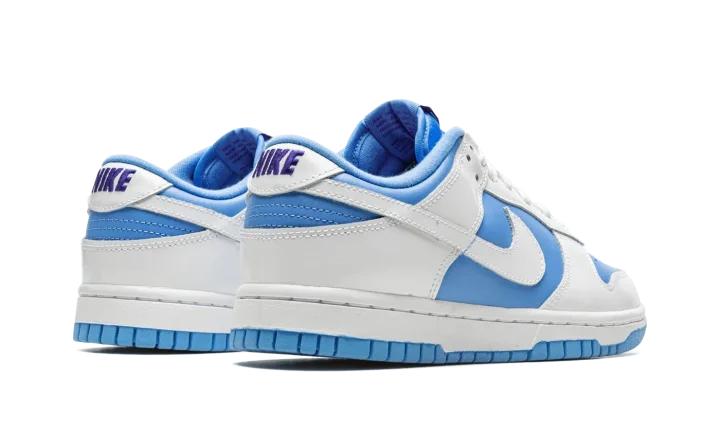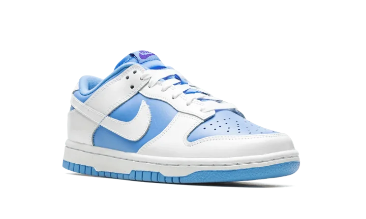 The Women's Nike Dunk Low "Reverse UNC" is a women's-exclusive colorway that flips the color block of the original "UNC" Dunk from 2021. As its name implies, the "Reverse UNC" inverts the "UNC's" white and blue color block. The perforated toe, mid-panel, collar, and heel are designed in University Blue leather. Contrasting white leather appears on the overlays and Swoosh branding. A Concord-colored "Nike" logo is embroidered on the heel. Additional Concord accenting can be found on the "Nike" and Swoosh logos on the white nylon tongue tag. A white midsole and University Blue-colored rubber outsole finish off the shoe's collegiate-inspired look. Release date: August 2, 2022