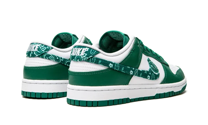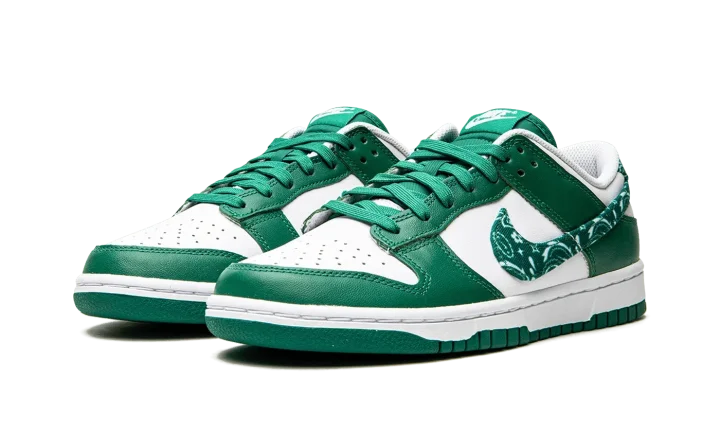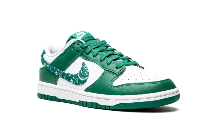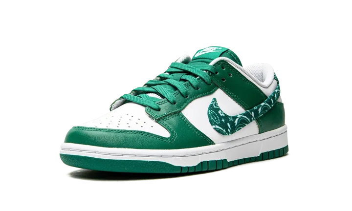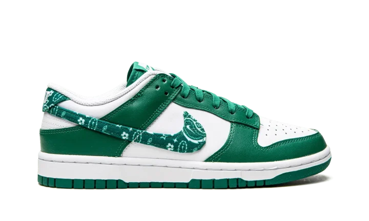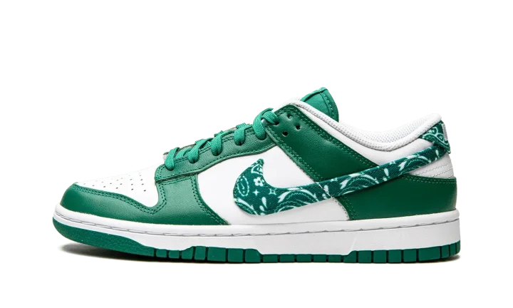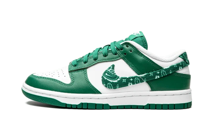 The Women's Nike Dunk Low "Green Paisley" is a women's-exclusive colorway that switches up the design of the Swoosh branding on the classic basketball and lifestyle shoe. From Nike's Spring 2022 release cycle, the "Green Paisley" features the same two-tone color block of many legendary Dunk styles, albeit with a modified green paisley Swoosh on the sides that replaces the model's standard leather branding. The upper is complete white a white leather base with contrasting green leather overlays. Classic "Nike" branding is embroidered on the green paisley heel tab and printed on the tongue tag on the green nylon tongue.