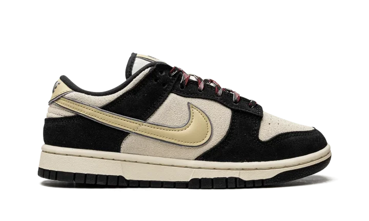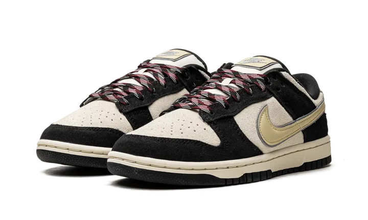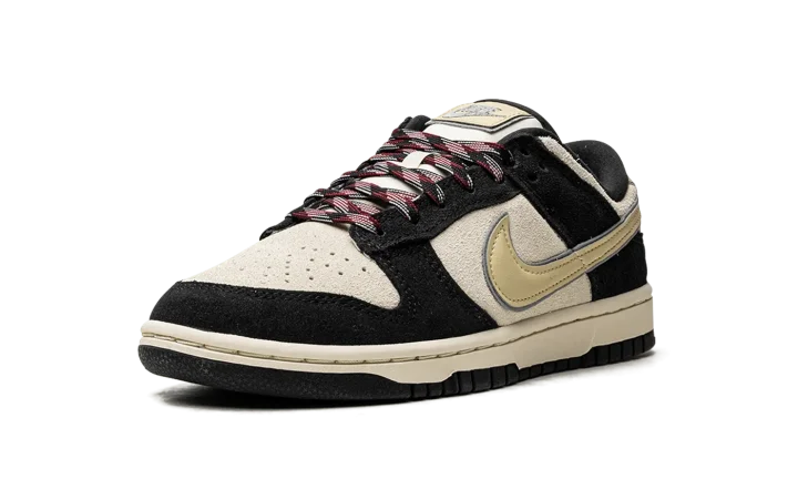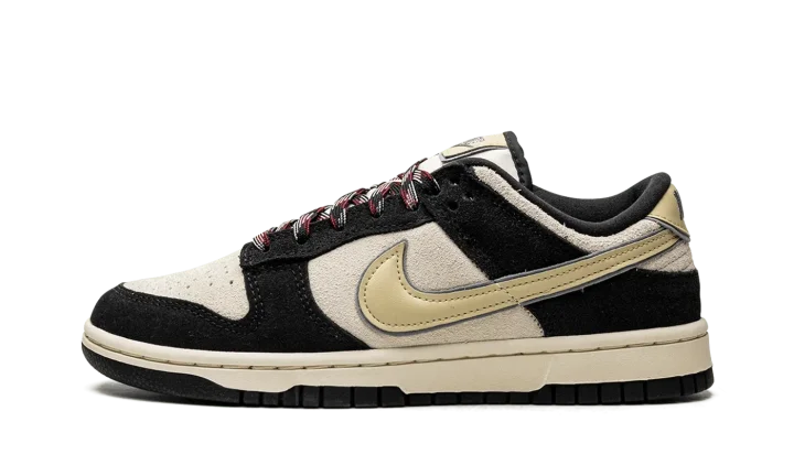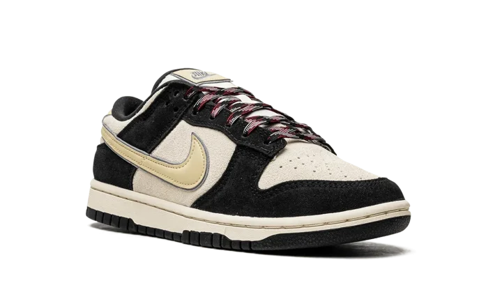 The Women's Nike Dunk Low LX "Black/Cream Suede" is an alternate version of the women's edition of the retro basketball shoe that updates its design with lifestyle-inspired materials. The Dunk Low LX features the same overall appearance as the standard Dunk, but with different textiles instead of the shoe's original leather build. On the "Black/Cream Suede," the shoe features a cream suede base with contrasting black suede overlays. A Coconut-Milk-colored leather Swoosh is located on the sides. Classic "Nike" branding is embroidered on the heel and printed on the tongue. Unique red, white, and black laces complete the look.