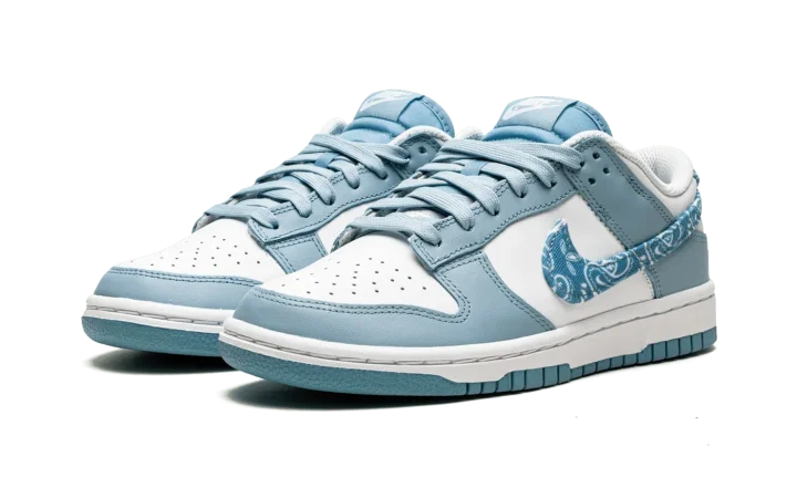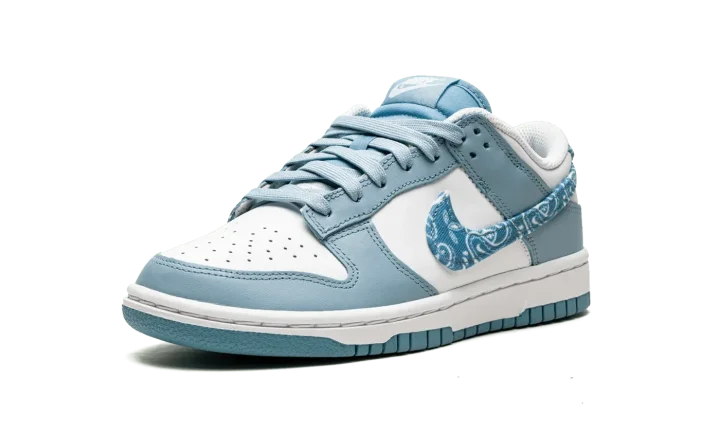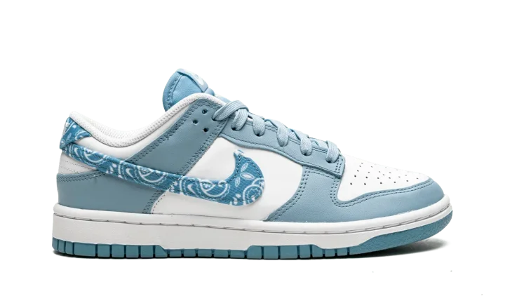 The Women's Nike Dunk Low "Blue Paisley" is a women's-exclusive colorway of the classic basketball and lifestyle shoe that modifies the shoe's iconic Swoosh branding in an interesting way. One of several "Paisley" Dunks released for women in 2022, the "Blue Paisley" features the same two-tone color block of many legendary Dunk styles, albeit with a modified blue paisley Swoosh on the sides that replaces the model's standard leather branding. The upper features white leather on the perforated toe and on the mid-panel. The leather overlays are arranged in a Worn Blue hue. Classic "Nike" branding is embroidered on the blue paisley heel tab and printed on the tongue tag, as well.