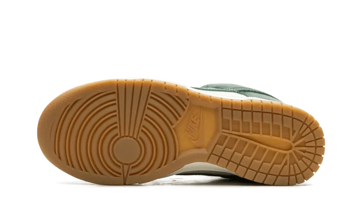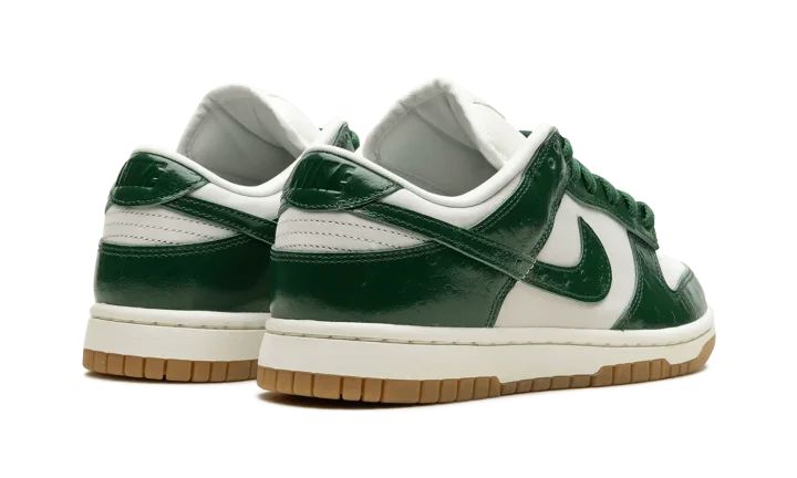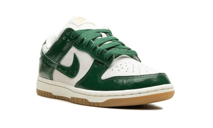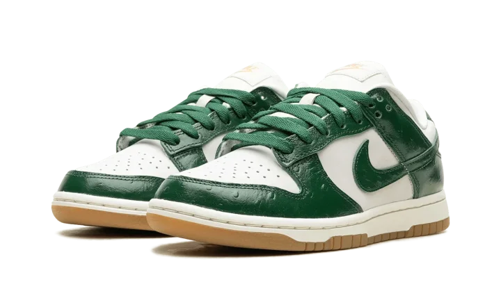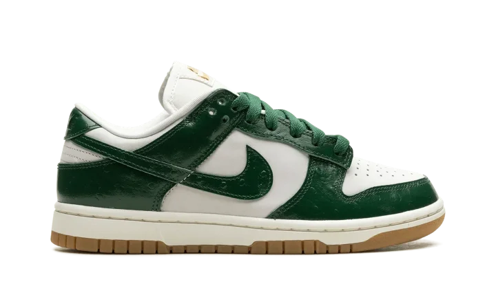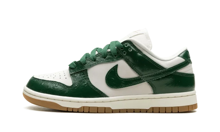 The Women's Nike Dunk Low LX "Gorge Green Ostrich" is a women's-exclusive colorway of the classic basketball shoe made with attention-seeking faux ostrich leather. The Dunk Low LX in "Gorge Green Ostrich" champions a premium look with ostrich leather overlays in a Gorge Green hue complemented with a white leather base. Classic branding elements include a debossed "Nike" logo on the heel and gold "Nike" and Swoosh logos on the tongue tag. The Sail rubber midsole and gum rubber outsole complete the look. Release date: February 17, 2024
